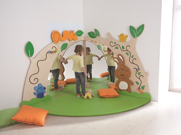 Развивающая панель с лиственными деревьями и матом для пола служит для оформления угловой зоны и за счет зеркал расширяет пространство.