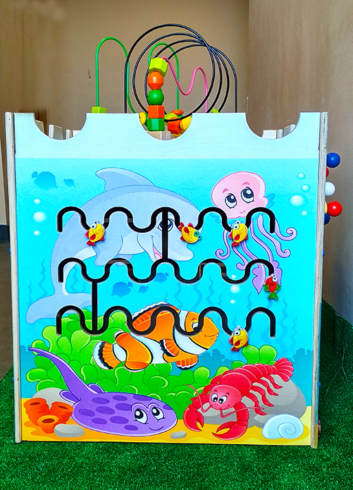 Напольный куб для одновременной игры. Каждая сторона представляет собой развивающую игровую панель. Выполнен в морской тематике с нанесенными при помощи УФ печати изображениями. Красочный дидактический куб для украшения любой группы детского сада или игровой комнаты.