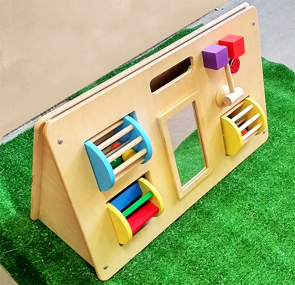 Треугольная настольная панель с двумя игровыми поверхностями. На каждой из которых размещены развивающие игровые элементы. Выполнено из шлифованой фанеры. покрыто экологически чистым бесцветным лаком. Все детали покрашены безопасной для детей ВД краской. Вращающиеся барабаны, вращающееся зеркало, счеты, шестеренки. и т.д.