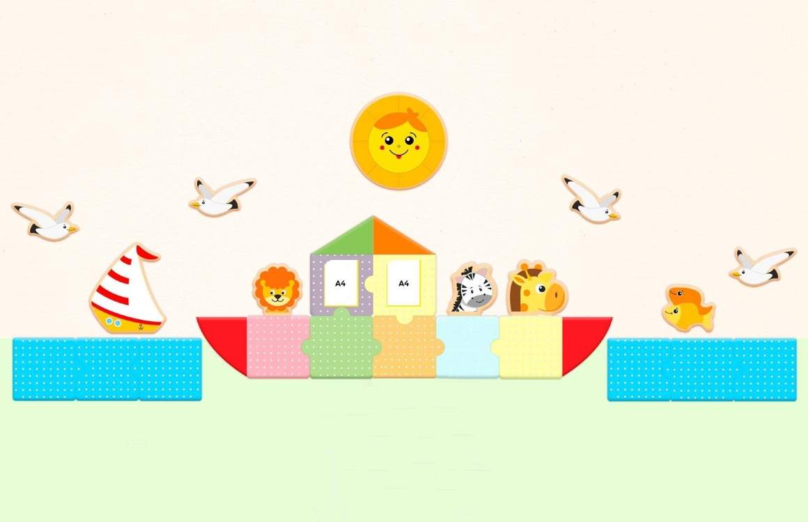 Комплектация : панели "Пазл" - 13 шт, нос и крыша корабля, солнце, рыбки, чайки - 4 шт, парусник, жираф, зебра, лев, карманы А4 - 2шт.
