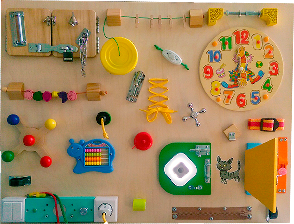 Представляет собой стенд с набором бытовых предметов, различных цветов, фактур, размеров. Включает в себя электрическую составляющую (от батареек). При включении вилки в розетку подается питание на лампочки. При вращении ручки регулируется яркость свечения центральной лампы. Если штекер вставить/вытащить из гнезда загораются соответствующие лампочки. Каждая кнопка выключателя управляет своим светодиодом. Встроено звуковое оповещение при нажатии кнопки.