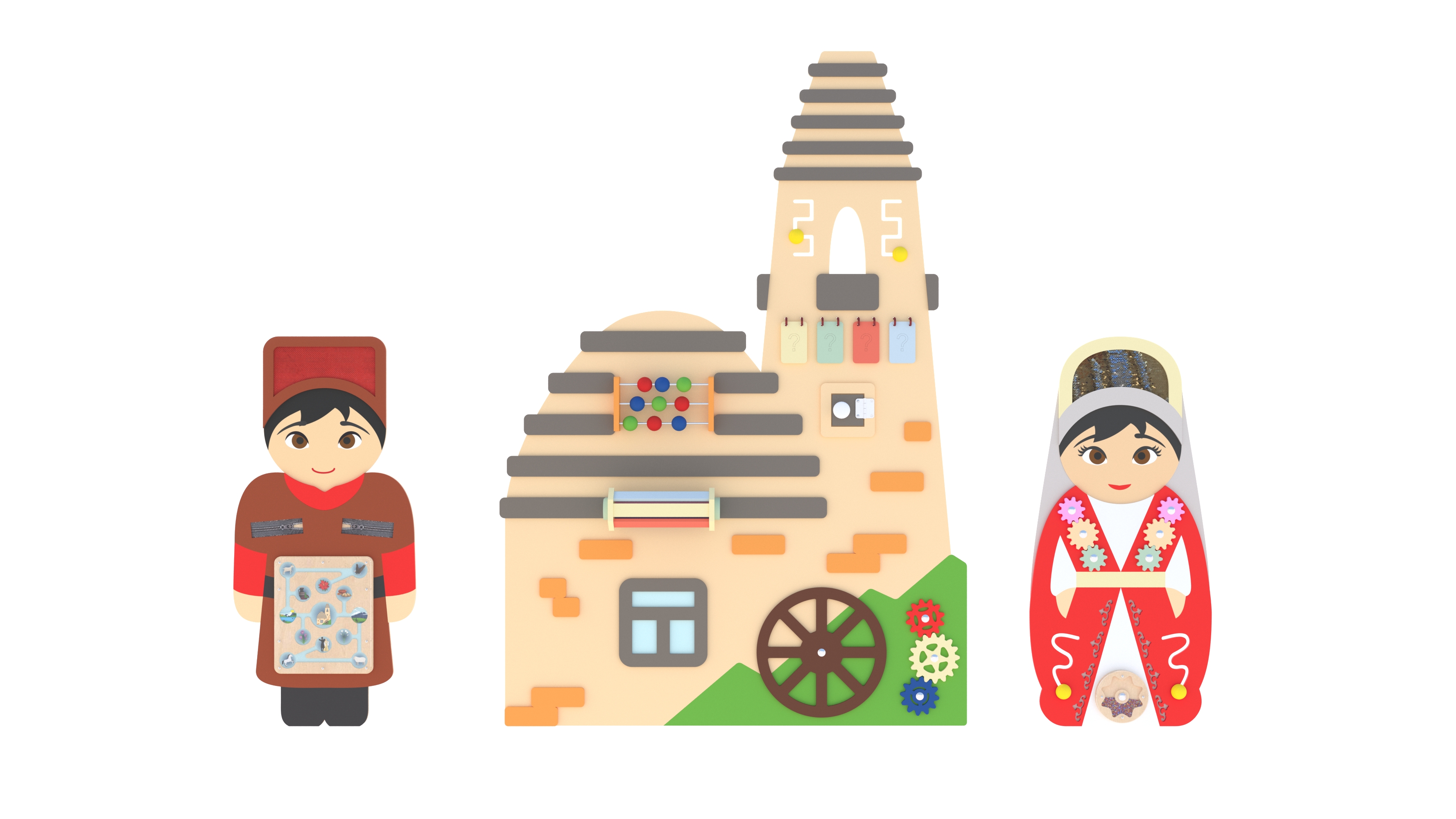 Бизиборды и настенные панели значительно облегчают задачу педагогам и заведующим в выполнении новых ФОП ДО. Они специально разработаны для того, чтобы наглядно и понятно для маленького ребёнка представить культуру различных народов нашей страны. На них изображаются представители народа в национальных костюмах с традиционными орнаментами или узорами, жилище, элементы быта и промысла. Чтобы детям было интересно трогать, изучать то, что они видят, на бизибордах и панелях расположены тактильные элементы. Это стимулирует запоминание, дополняет эмоциональную связь с той информацией, которую транслирует педагог. Бегунки, шестеренки, лабиринты и пайетки привлекают, удерживают внимание, способствуют развитию мелкой моторики рук.