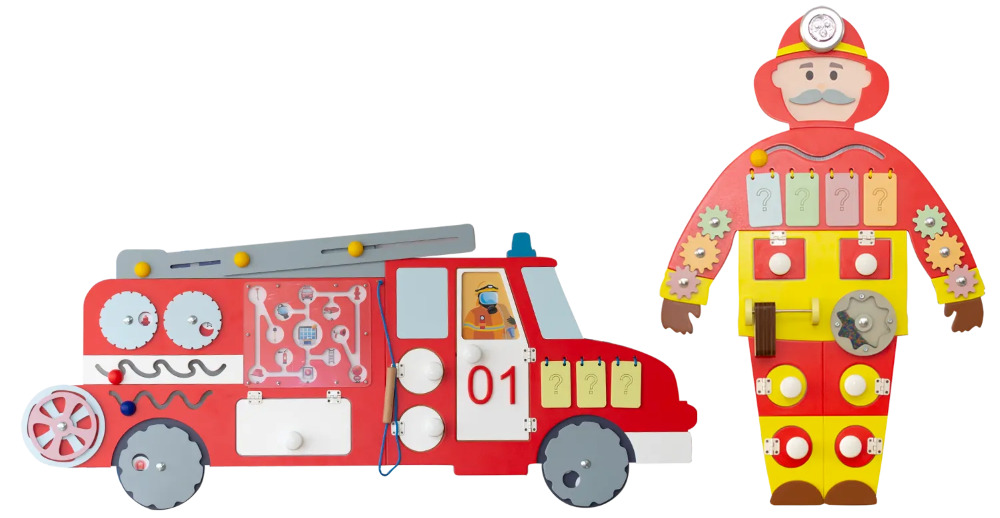Это обучающий комплект для знакомства с важной профессией. Набор включает в себя два ярких и увлекательных бизиборда – “Пожарный” и “Пожарная машина”. Этот комплект поможет детям познакомиться с одной из самых героических и важных профессий, развивая у них чувство ответственности, понимание необходимости помощи другим и навыки безопасности. Бизиборды оснащены разнообразными развивающими элементами, которые способствуют развитию мелкой моторики, логического мышления и координации движений.