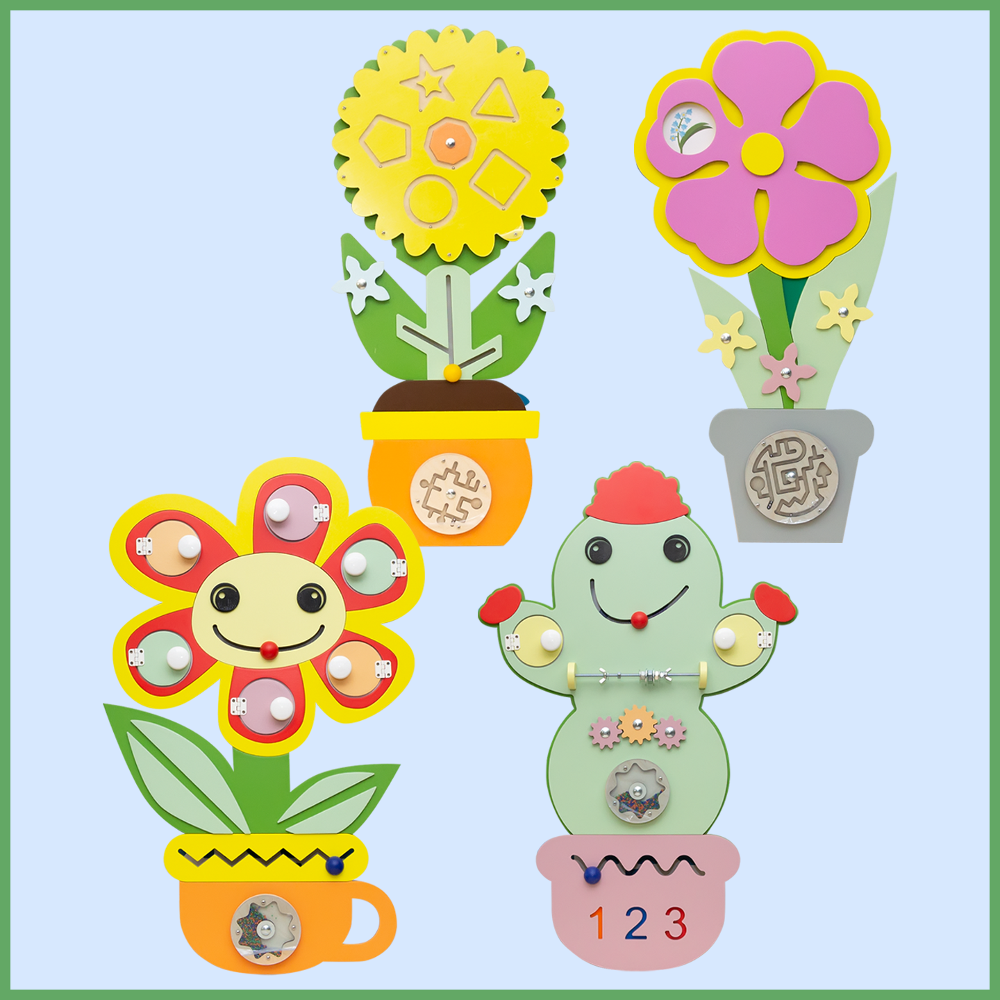 Набор бизибордов для оформления в едином стиле помещений дошкольного учреждения. Способствует развитию мелкой моторики и познавательного интереса у детей 3-7 лет.