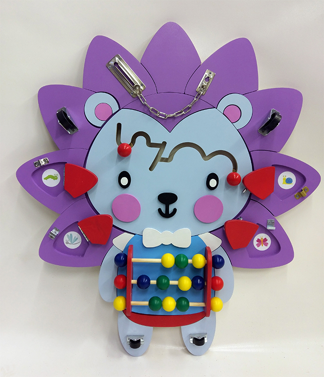 Ежик 650х650х30 мм., на нем расположены цепочка, лабиринт для движения по прорези, ролики, 4 дверцы с замочками различных видов, счеты. Под каждой дверцей расположено изображение.