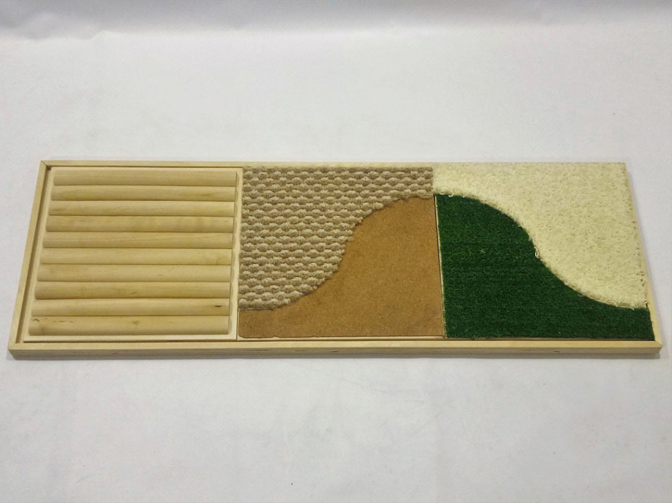 Набор состоит из деревянной платформы и трех тактильных панелей (размер каждой 30х30 см). Платформа крепится на стену и в нее вставляются панели с различными текстурами для развития тактильных ощущений.