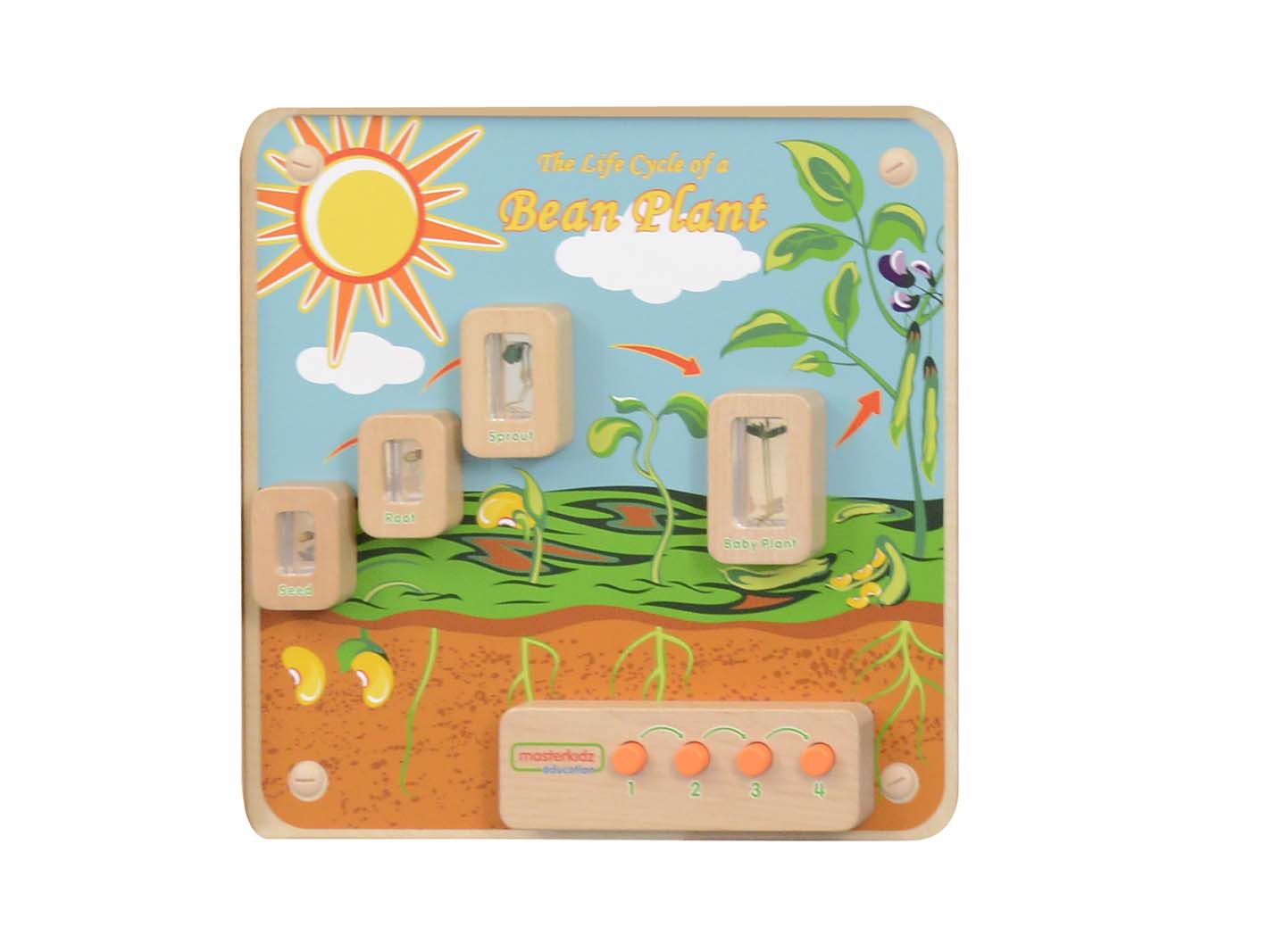 Панель содержит настоящие образцы бобов, в прозрачных акриловых блоках, которые позволяют детям внимательно изучить стадии жизни растения, начиная с семени и заканчивая врослым растением. Можно подробно изучить каждый этап, используя подсветку. Аккумуляторы не включены.