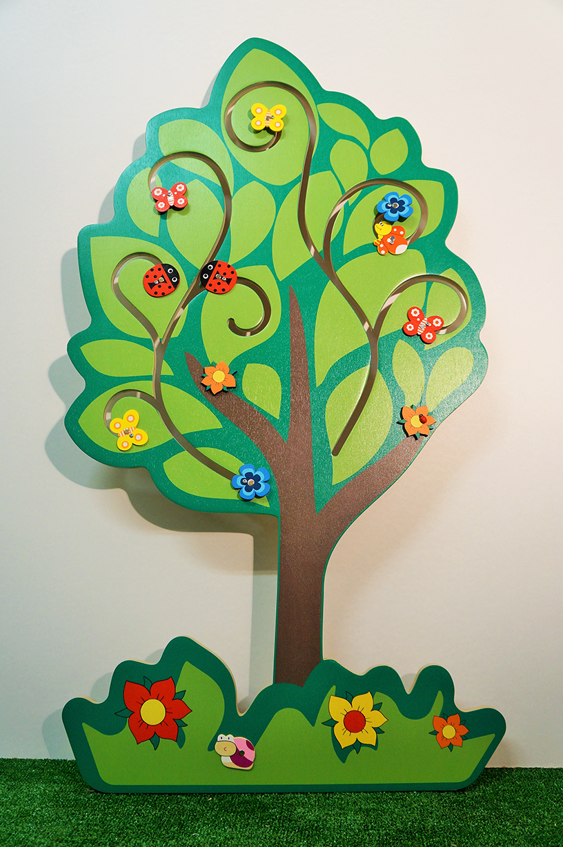 Дерево выполнено из фанера, на лицевую сторону нанесено полноцветное изображение с матовой ламинацией, защищающей от механических повреждений и выцветания. На кроне сквозные лабиринты, по которым движутся деревянные фигурки. Изделие крепится к стене, с опорой на пол.