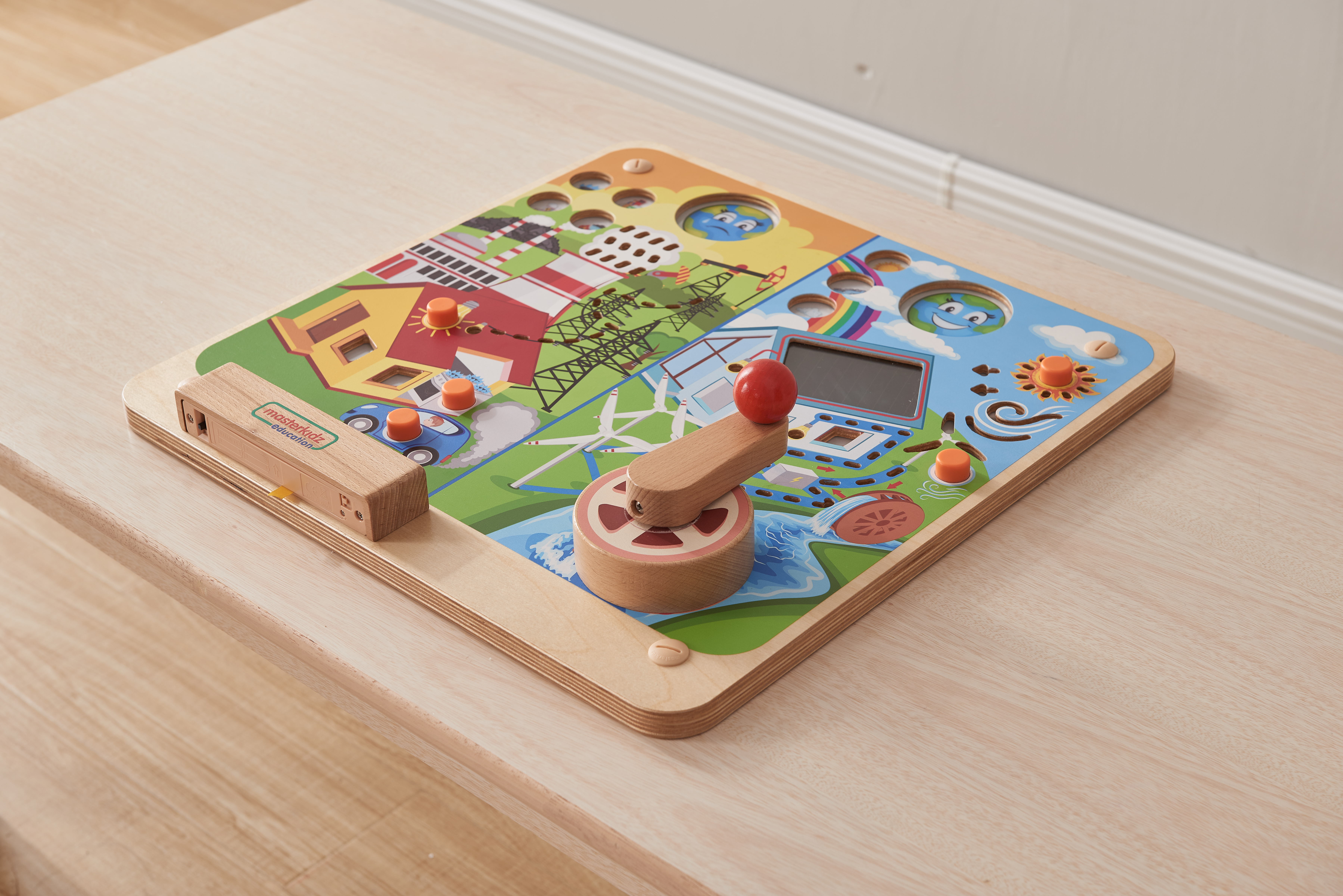 Панель разделена на 2 части. Левая сторона -несчастная земля, потребляющая невозобновляемые ресурасы. Правая сторона-счастливая земля, использующая возобновляемую энергию. Используются световые эффекты: на крыше дома установлена солнечная панель, освещающая свет в доме; а ручной гидрогенаратор помогает детям увидеть как потоки воды генерируют энергию. Размеры: 460мм*460мм*85мм.
