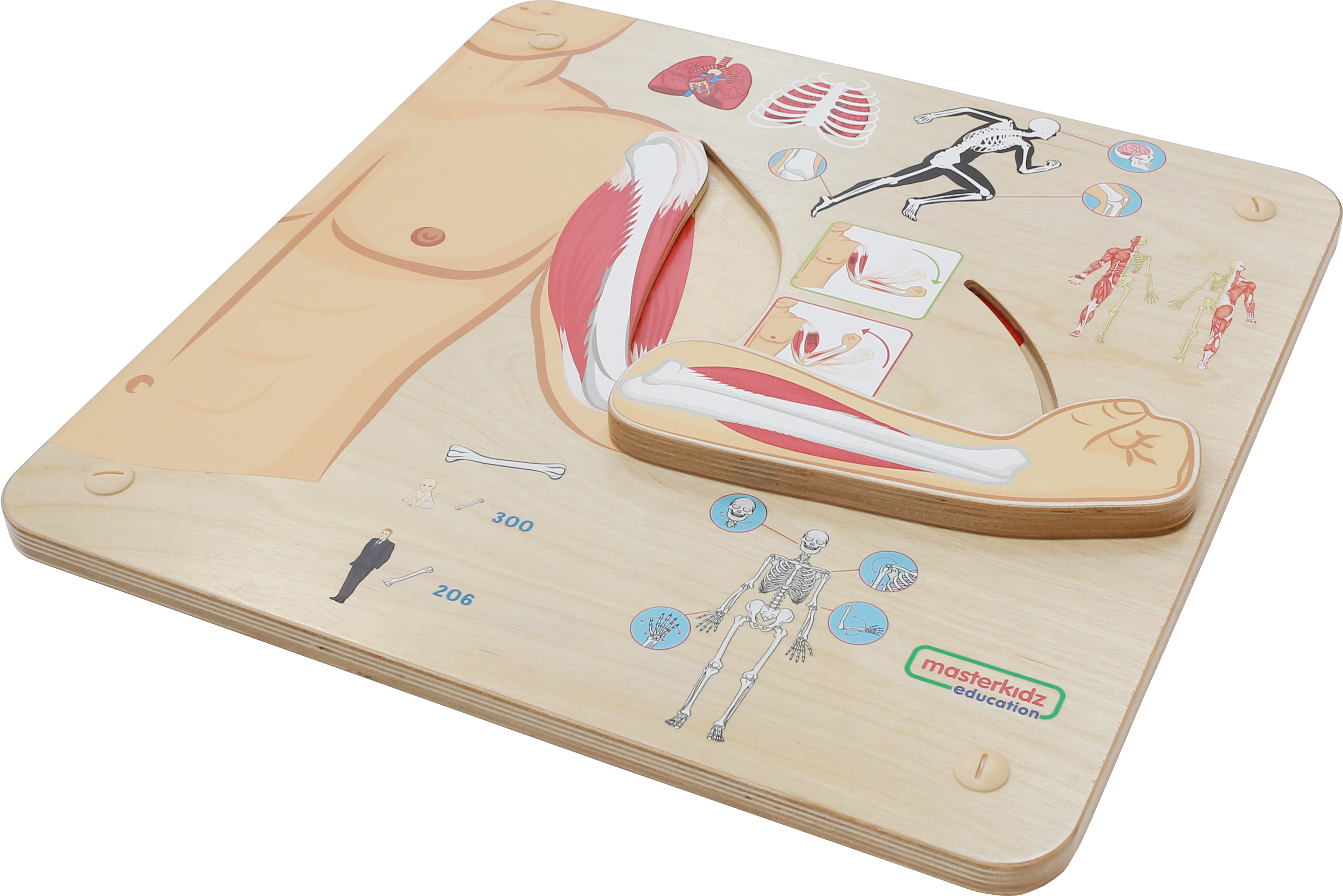 Настенная панель выполнена из березовой фанеры, на лицевой стороне которой изображен макет мышечной системы человека, который дает детям более глубокое понимание того, как работают мышцы и скелет, когда мы находимся в движении.
