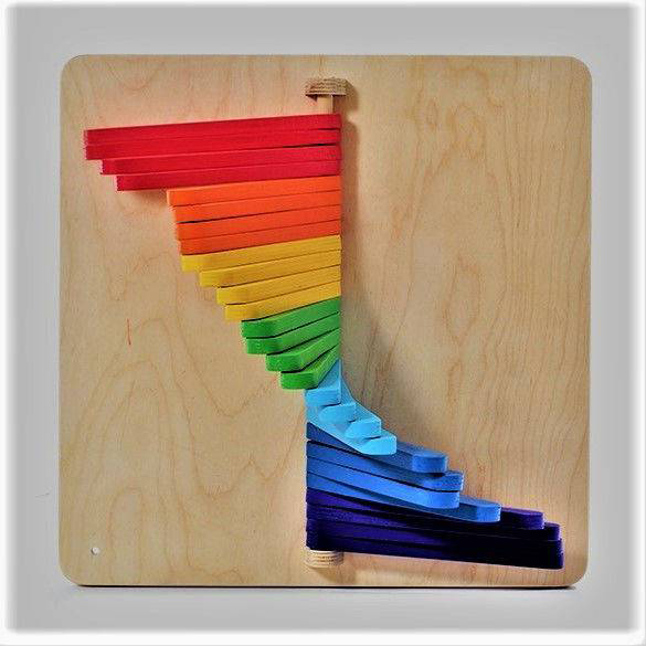 На панели "Радуга" закреплены 16 цветных деревянных брусков, вращающихся вогруг оси. С помощью панели можно формировать представления о геометрических формах, об их размере и цвете.