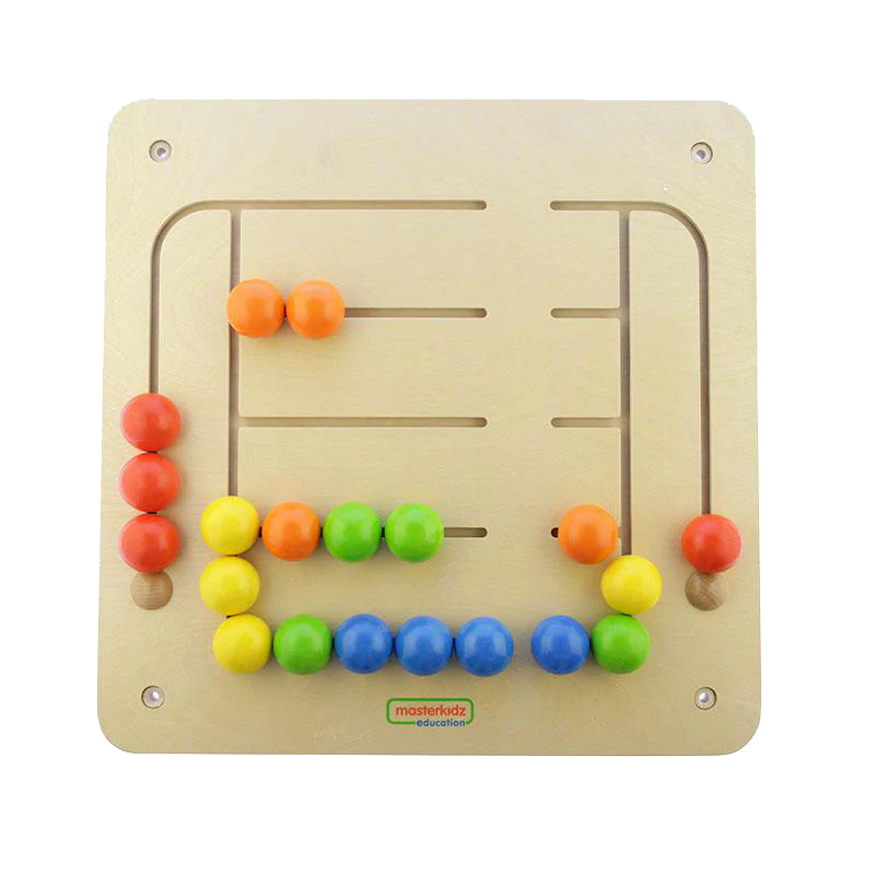 Настенная панель выполнена из березовой фанеры, на лицевой части выполнены прорези в виде лабиринта, в которых подвижно закреплены шарика различного цвета. Панель содержит детали 6 цветов, по 4 детали каждого цвета. По углам панели размещены отверстия для крепления к СТЕМ стене при помощи направляющих (в комплект не входят).