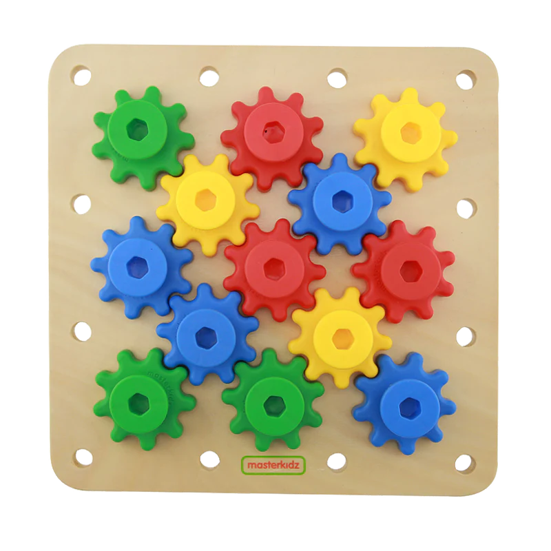 На поверхности панели имеются отверстия с набором шестеренок и болтиков. Ребенок, используя воображение, может создавать различные конструкции (шестеренки можно укладывать многослойно).