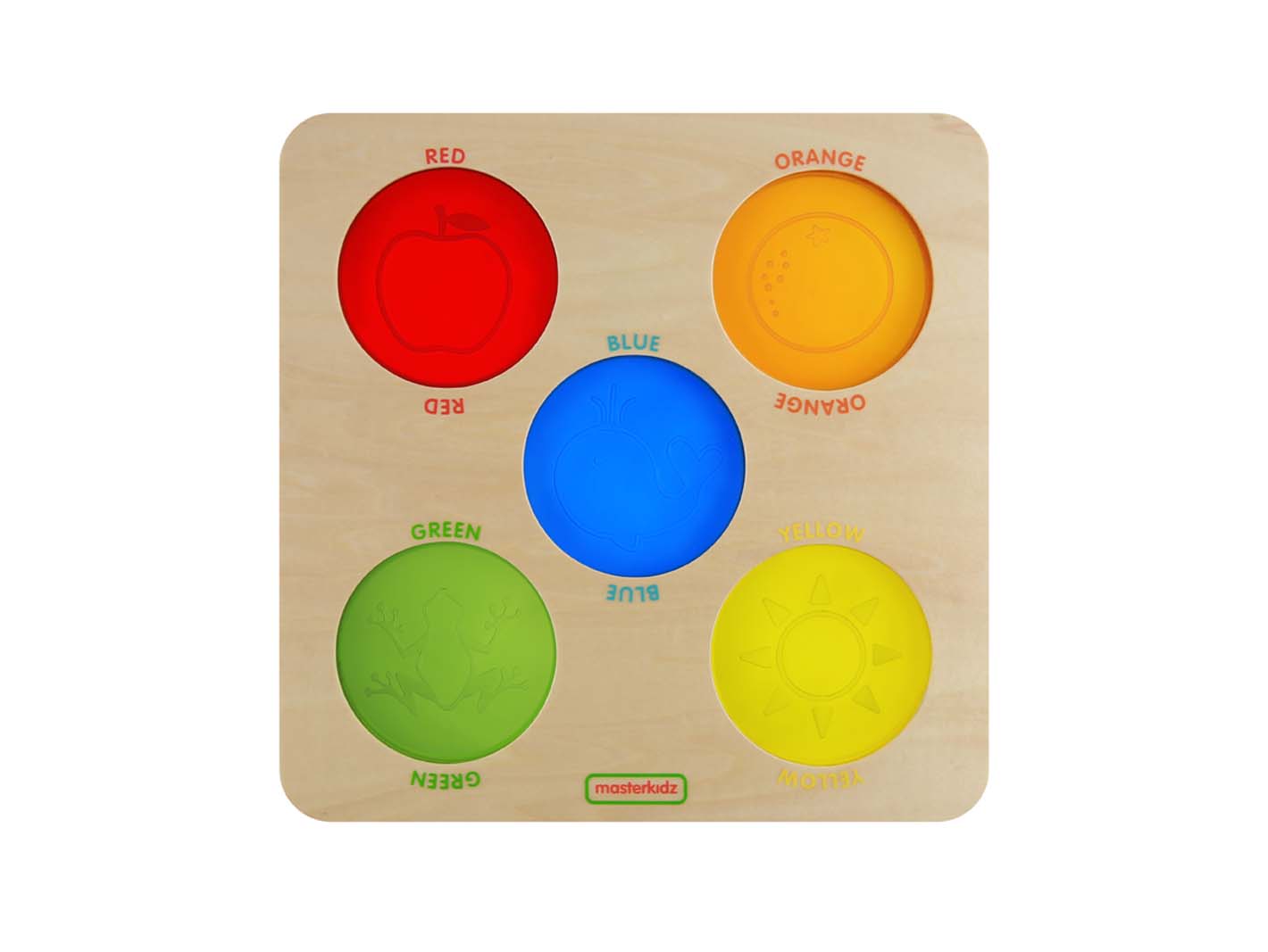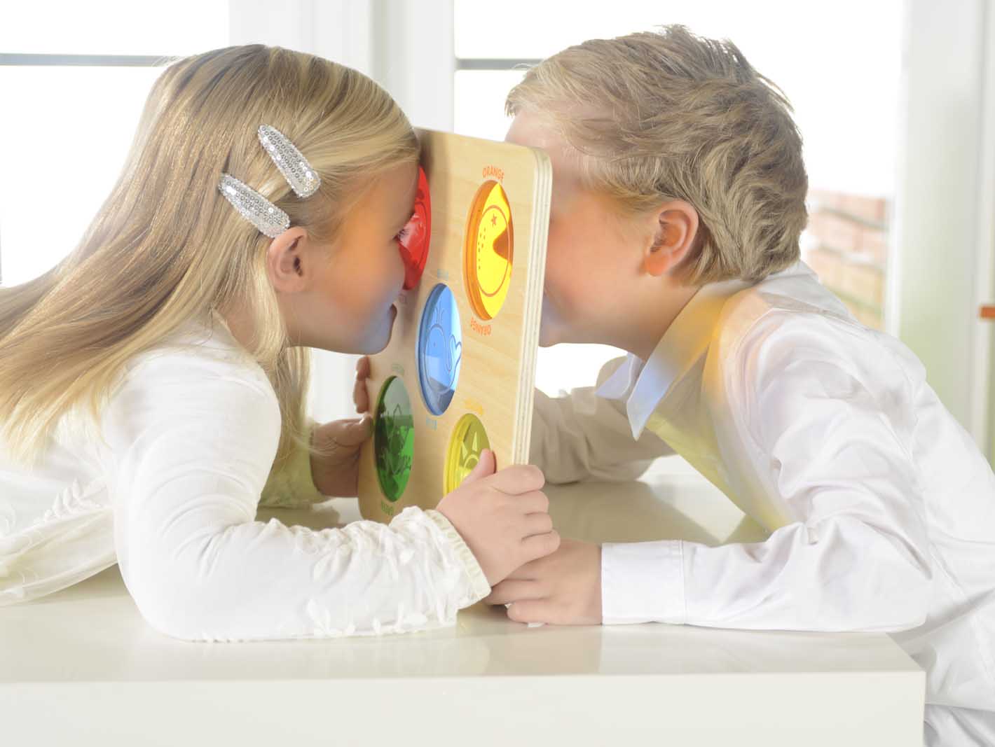 Основание панели выполнено из березовой фанеры, на поверхности которой представлены 5 полупрозрачных кругов в красном, желтом, синем, зеленом и оранжевом цветах. С ее помощью дети могут узнать о разнообразии цветов и весело исследовать мир с помощью цветных кружочков.
