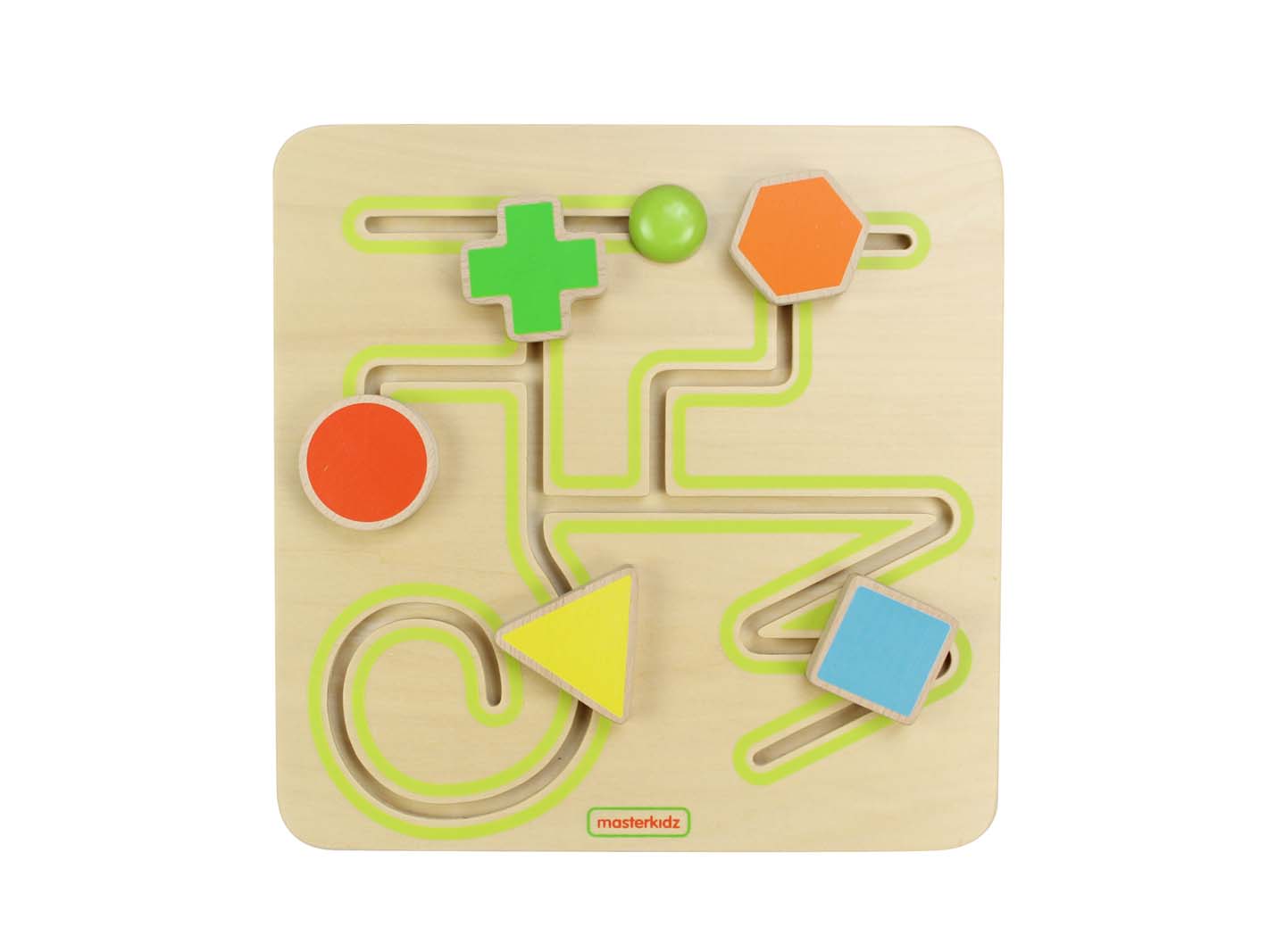 Панель представлена в виде лабиринта с цветными передвигающимися геометрическими фигурами (треугольник, квадрат, круг, крест, шестиугольник) по различным линиям.