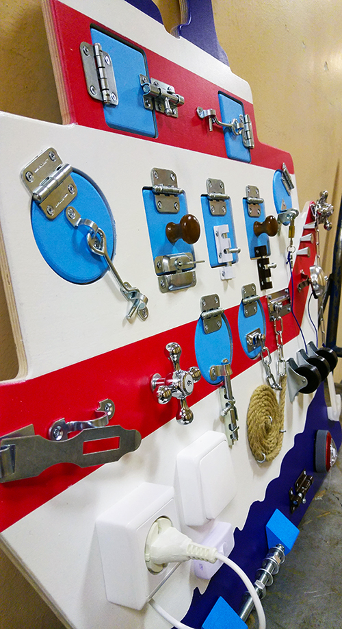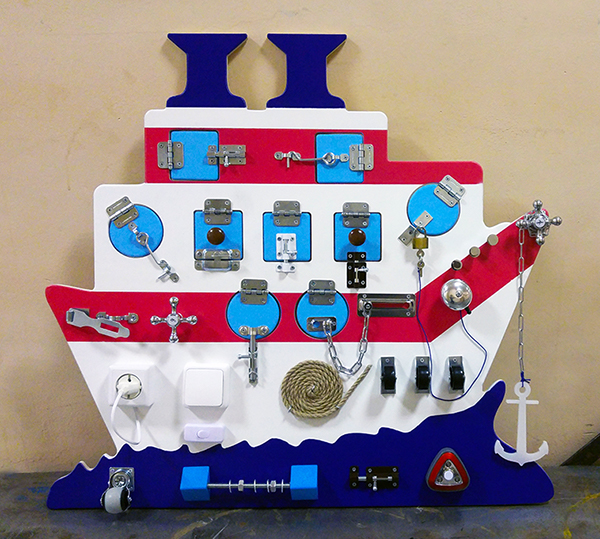 Большая развивающая дидактическая панель Кораблик, размером 90х90 см. Представляет собой фанерную основу в форме корабля с навесными развивающими элементами.