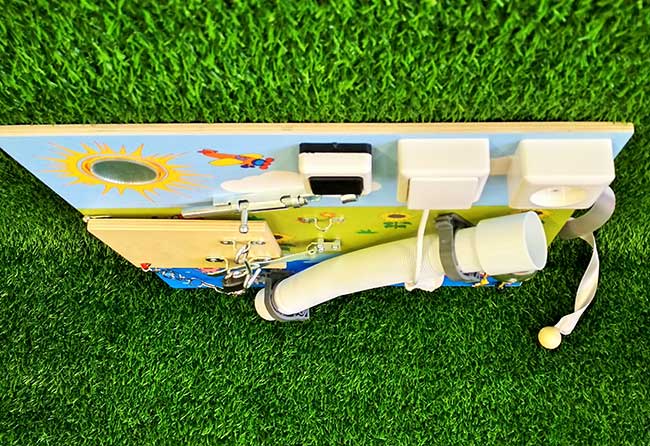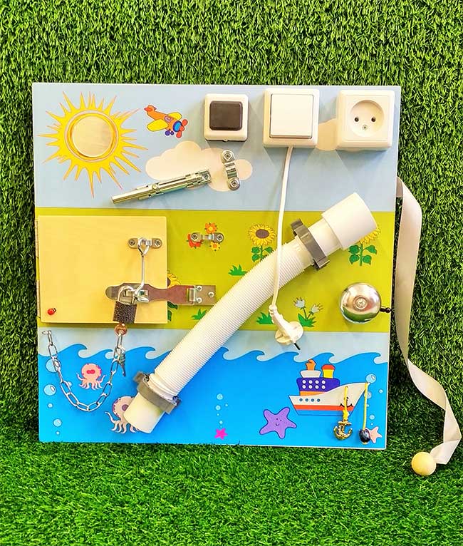 Игра развивающая типа «Бизиборд» с креплением на стену. Представляет собой щит из фанеры с зонально нанесенными, при помощи печати, изображениями, на который закреплены подручные бытовые приспособления