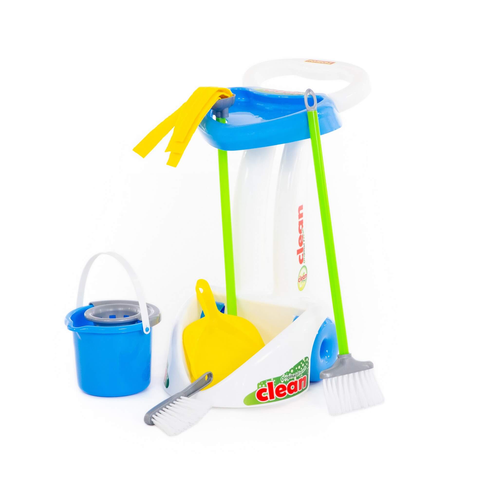 Все принадлежности компактно расположены на передвижной тележке. В наборе имеются: швабра, большая и маленькая щётки, совочек, ведро с отжимом.