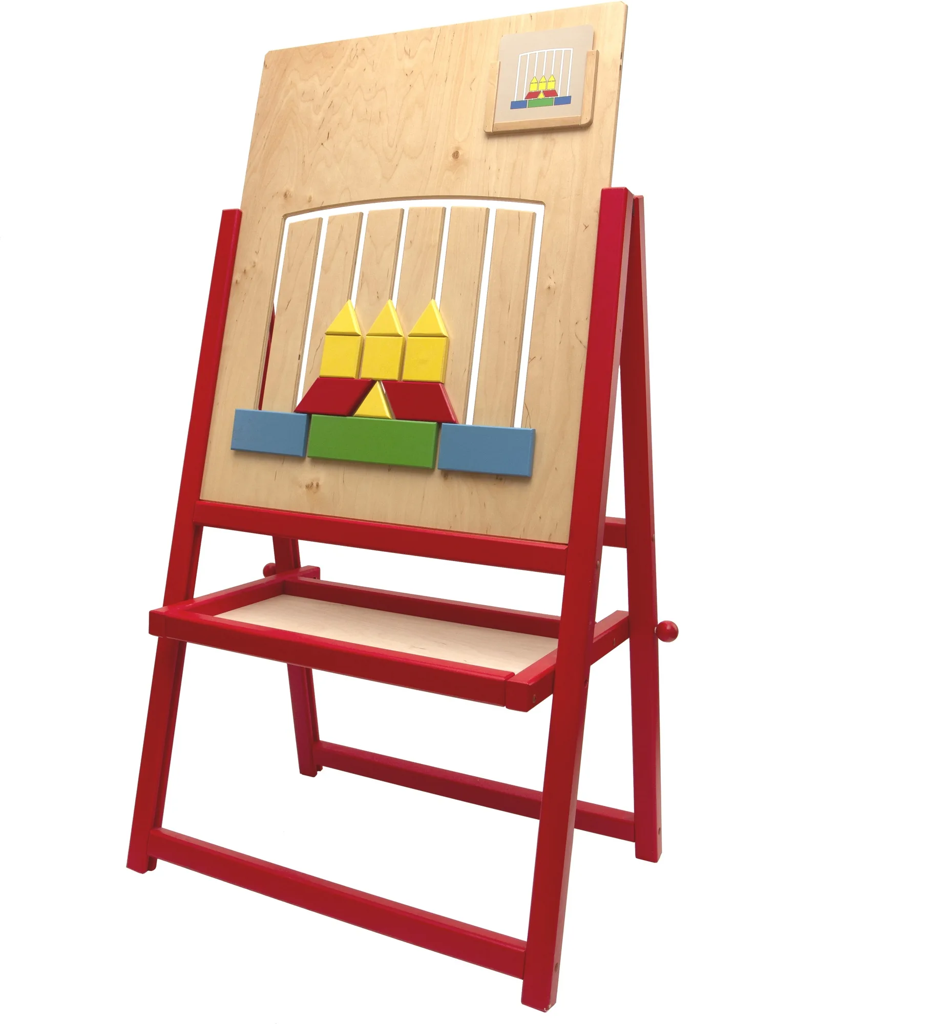 На панели с "экраном" расположены 7 прорезей-дорожек, по которым перемещают 12 подвижных геометрических форм (треугольник, прямоугольники, квадраты, трапеции и параллелограммы четырех основных цветов. Игровая задача - собрать геометрические форы в определенное место, например, ориентируясь на образец. На панели находится кармашек и 5 двусторонних карточек с заданиями.