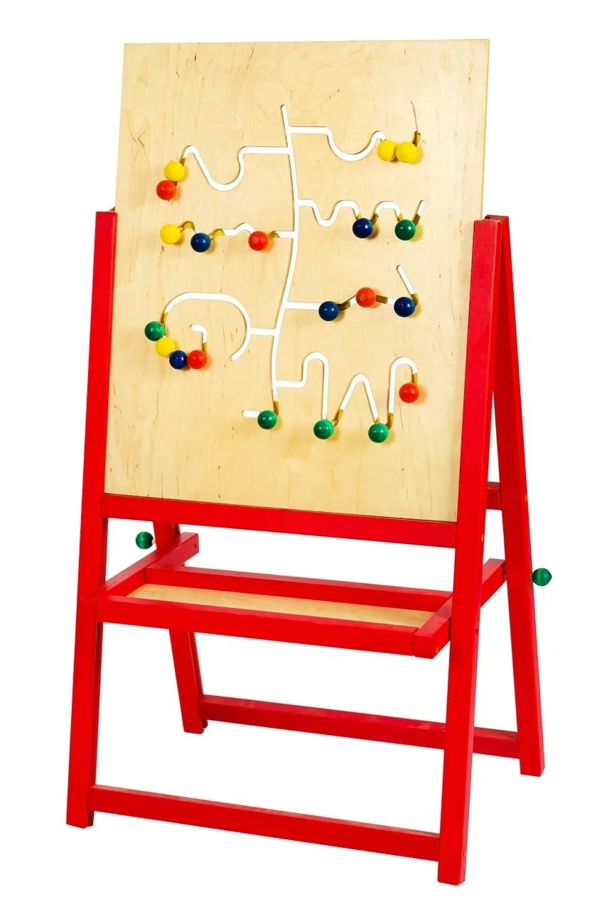 Двусторонняя неокрашенная панель стандартного размера с «экраном». «Экран» с фигурными сквозными прорезями в виде волн, зигзагов, лабиринтов и т.д. Внутри прорезей помещаются 20 двойных подвижных цветных штырьков: 5- красного, 5- синего, 5 – зеленого, 5- желтого цвета. Игровая задача – собрать штырьки какого – либо одного цвета в определенное место – «депо», проведя их через все встречающиеся на пути препятствия. На панели находится кармашек для карточек с заданиями.
