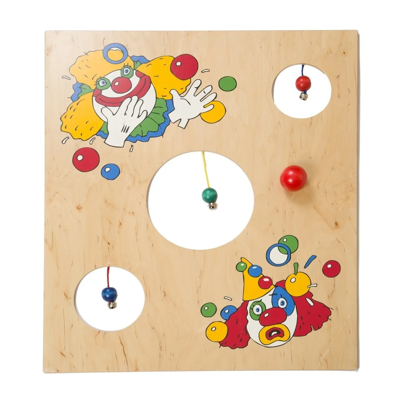 Панель с «экраном» с тремя вырезанными в нем круглыми отверстиями. Внутри каждого из 3 прорезанных кругов подвешены на длинном шнурке по одному цветному колокольчику – мишени. Для сбивания / попадания в колокольчики прилагаются 3 легких цветных шарика (пластиковых мячика). Игровая задача – попасть в колокольчик шариком – мячиком с определенного расстояния. Панель тренирует и развивает мышцы, суставы (мелкую и крупную моторику), ловкость, точность, сосредоточенность, внимательность, глазомер, координацию движений и действий. Панель дает возможность устраивать веселые соревновательные игры и развлечения, конкурсы и олимпиады с детьми дошкольного и младшего школьного возраста.