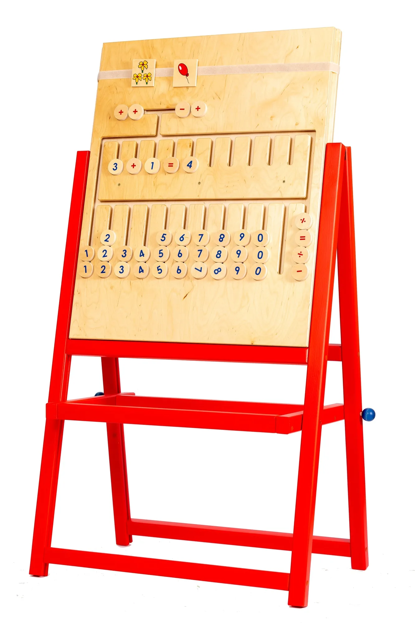 На одной стороне панели в прорезях расположены фишки с буквами русского алфавита (гласные красные, согласные черные), которые необходимо передвигать для составления слова. На другой - в прорезях находятся фишки с цифрами и арифметическими знаками, для составления и решения примеров.