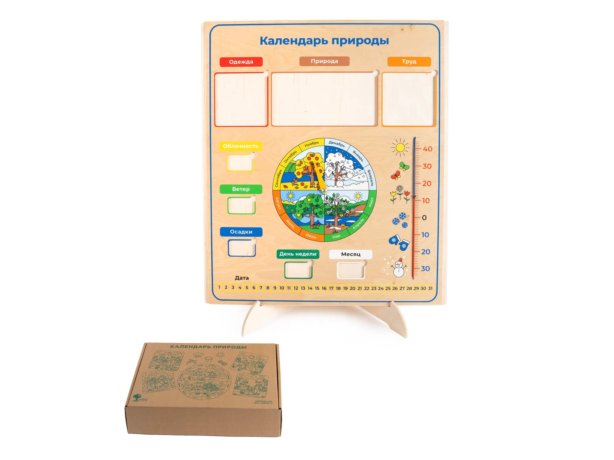 Наглядное пособие представляет собой деревянный планшет, на котором представлены: модели смены времени года; пиктограммы погоды разных сезонов, рисунки-символы, изображающие сезонный труд, сезонную одежду, явления природы.