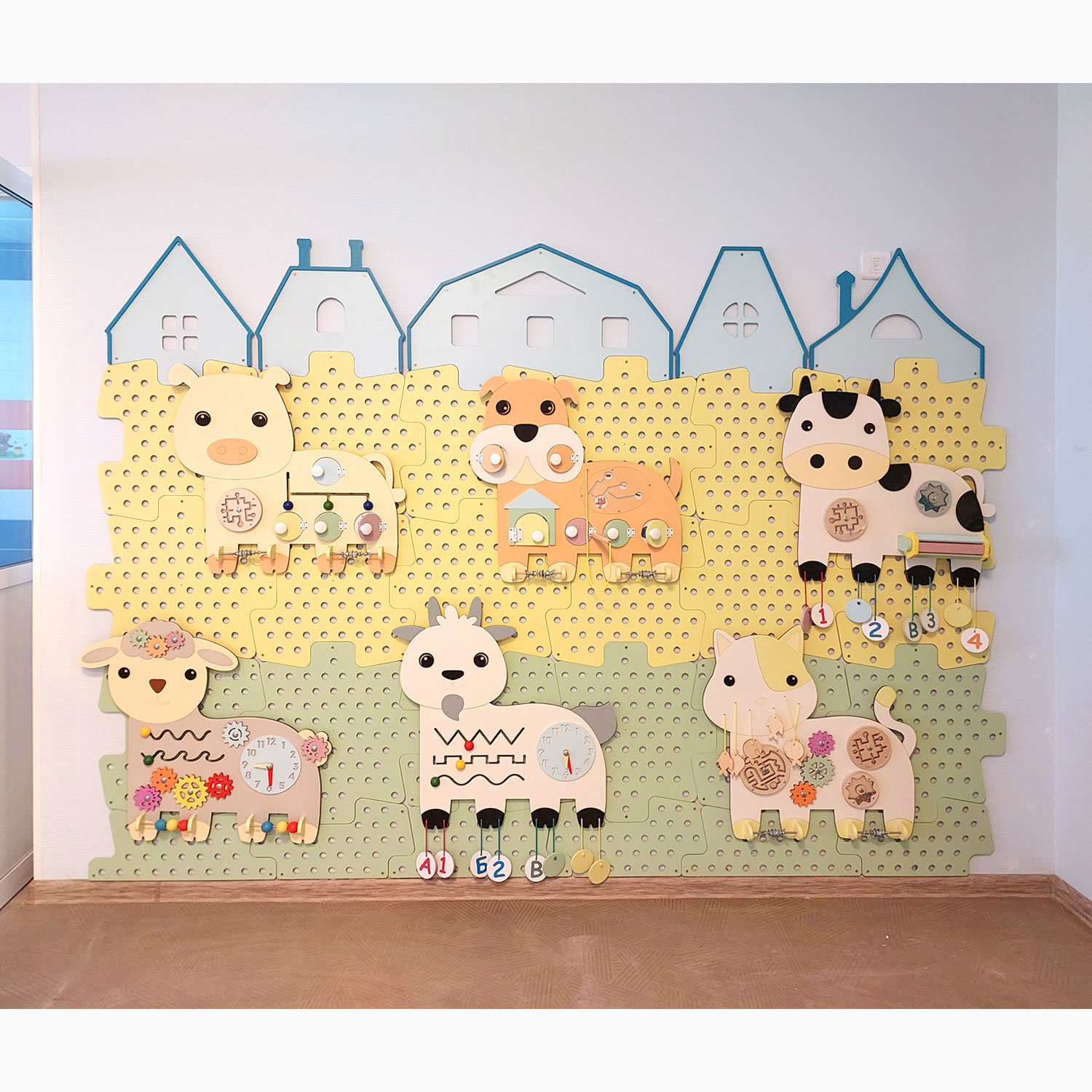 Комплект перфорированных настенных панелей с декоративным оформлением. Это готовый вариант для оформления стен в группе, коридоре детского сада.