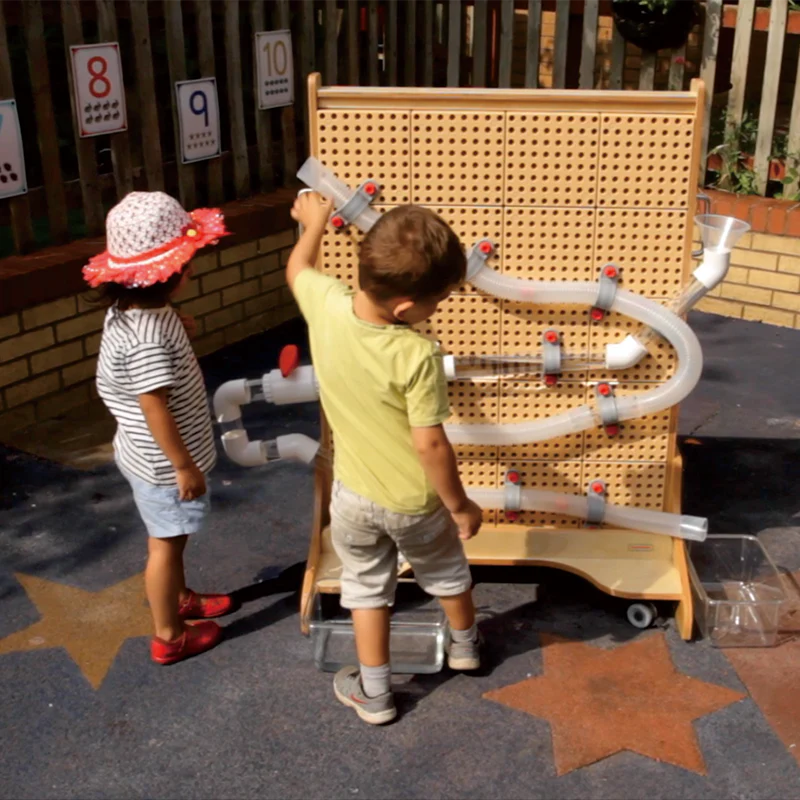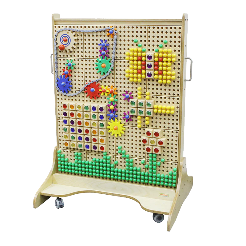 Вертикальная панель смонтирована на подвижном основании, подвижность обеспечивается 4 колесами. Основание выполнено из березовой фанеры толщиной 15 мм. Для монтажа образовательных наборов комплектуется пластиковыми панелями в виде квадратов в кол-ве 40 шт. На боковых частях основания расположены 2 металлические ручки для удобства перемещения.