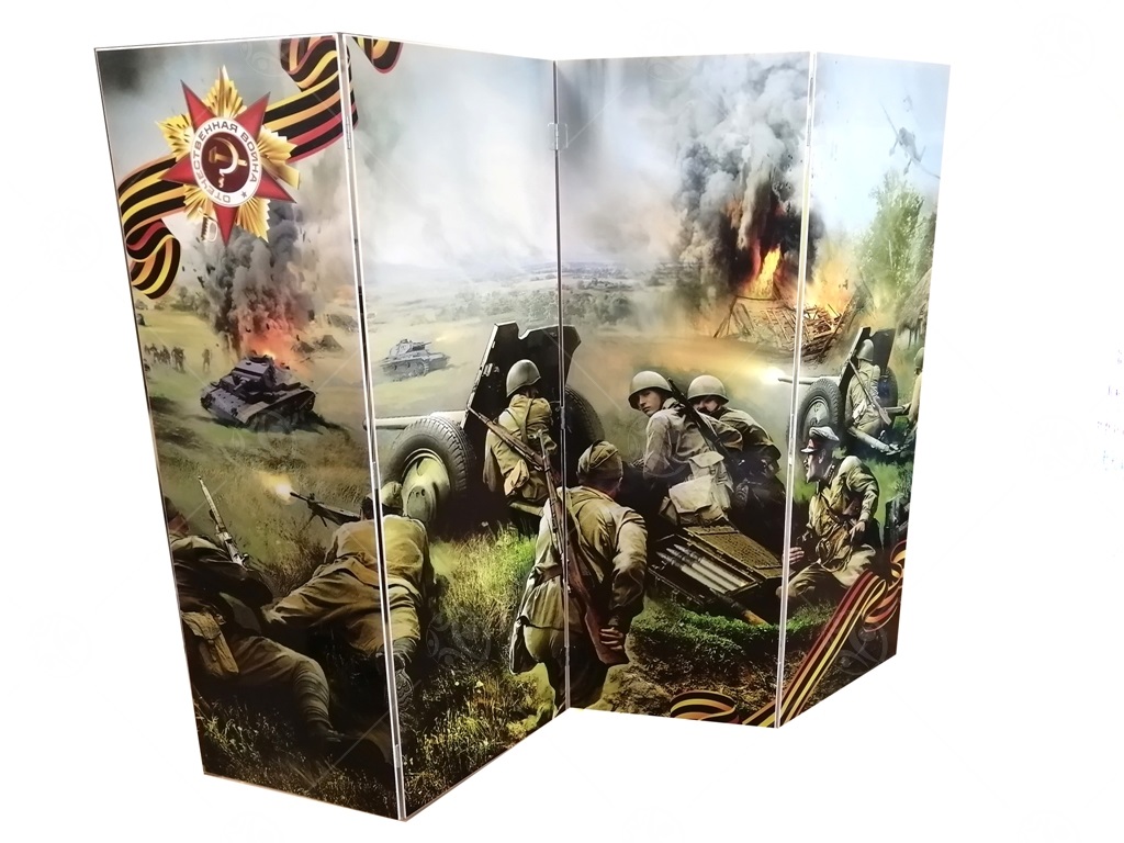 Ширма двухсторонняя, на второй стороне изображена тематическая декорация "Военные".