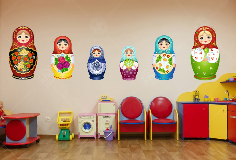 Настенная композиция "Матрешки" выполнена из пластика 3мм с нанесением полноцветного рисунка и состоит из шести настенных панно с изображением матрешек с разной росписью. Высота матрешек 1,2м, 1м, 0,8м.