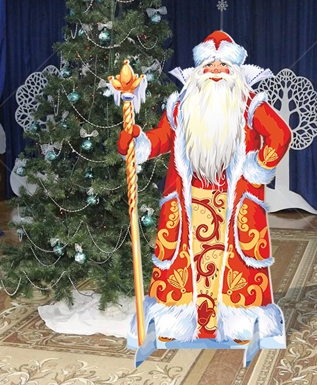 Театральная декорация "Дед Мороз Морозко" выполнена из МДФ, с нанесением полноцветного рисунка с двух сторон. Высота декорации 1,77м, ширина - 0,87м.