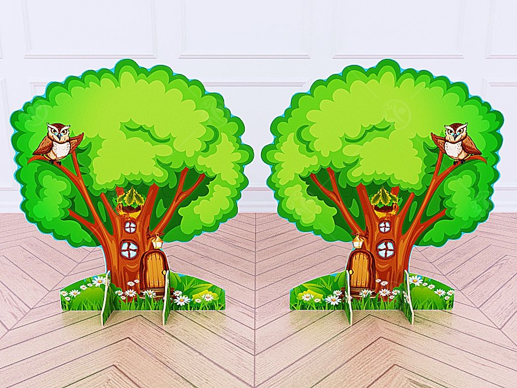 Театральная декорация "Дуб с филином" выполнена из МДФ, с нанесением полноцветного рисунка с двух сторон. Высота декорации 0,85м, ширина - 0,57м.