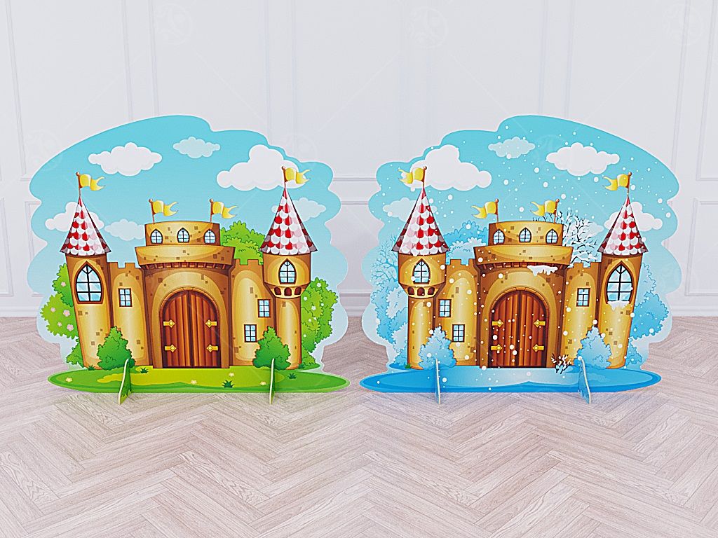 Театральная декорация "Средневековый замок" выполнена из МДФ, с нанесением полноцветного рисунка с двух сторон. Декорация имеет устойчивую подножку. Высота декорации 1,23м, ширина - 1,5м.