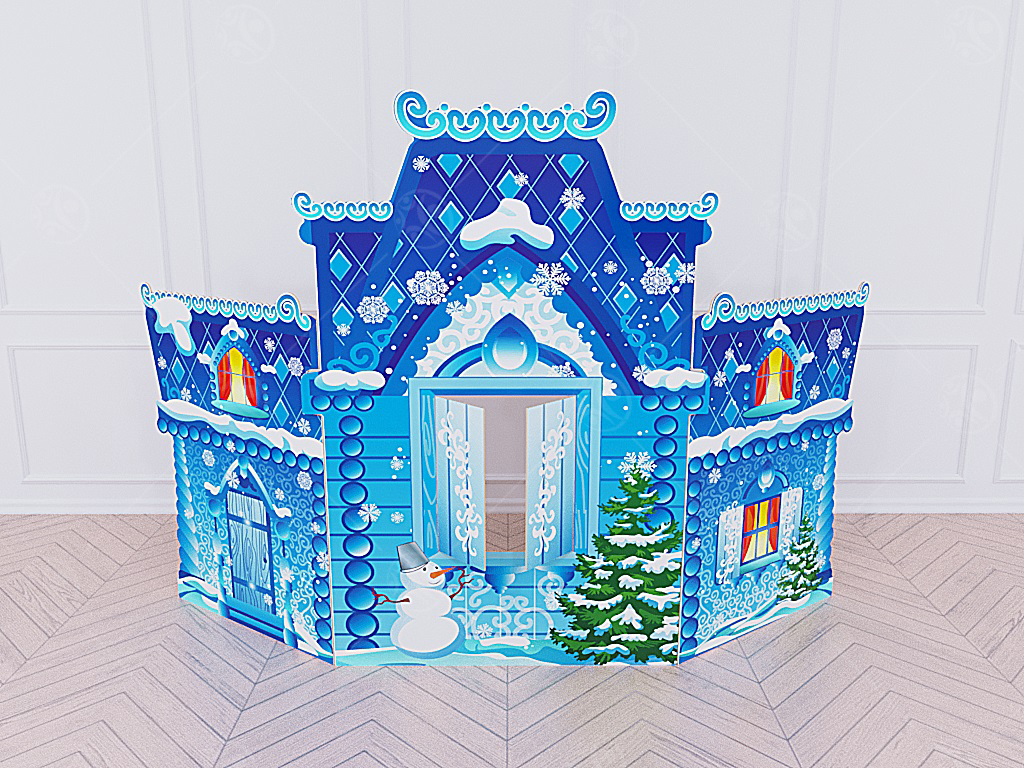 Театральная декорация "Замок зимний" (внутри-снаружи) выполнена из МДФ, с нанесением полноцветного рисунка с двух сторон. Высота декорации 1,8м, общая длина 3,2м, в замке есть окно с открывающимися ставнями. Декорация удачно впишется в постановку любой русско-народной сказки.