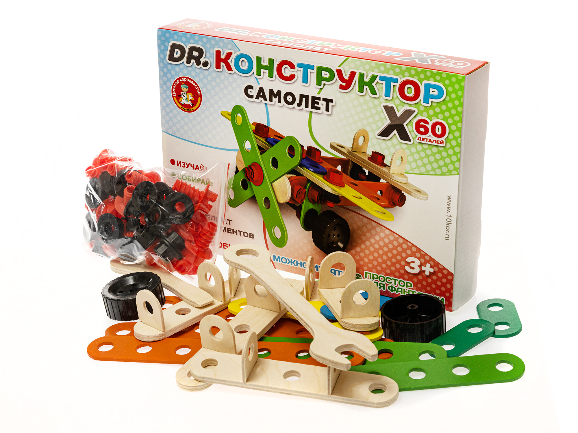 Деревянный конструктор Самолёт. Состав набора (всего 60 деталей): деревянные планки для сборки (жёлтый, синий, оранжевый, зелёный, неокрашенные детали) – 15 шт. (6,5 – 22,5 см), колёса из пластика – 2 шт. (5 см), ось металлическая – 1 шт. (13 см), болты из пластмассы (красный цвет) – 20 шт., гайки из пластмассы (чёрный цвет) – 20 шт., ключ и отвертка из фанеры. Материалы: дерево, фанера, с элементами из МДФ, пластмассы и металла. Игра предназначена для детей от 3 лет. Игра с деревянным конструктором позволяет проявлять фантазию и экспериментировать с игрушкой, развивает воображение, логическое мышление и моторику рук.