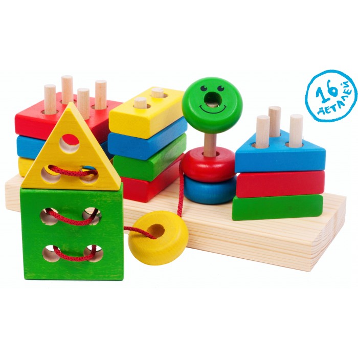 Деревянная платформа со штырьками, на которые необходимо правильно подобрать и надеть детали различной геометрической формы: квадратной, треугольной, прямоугольной и круглой.