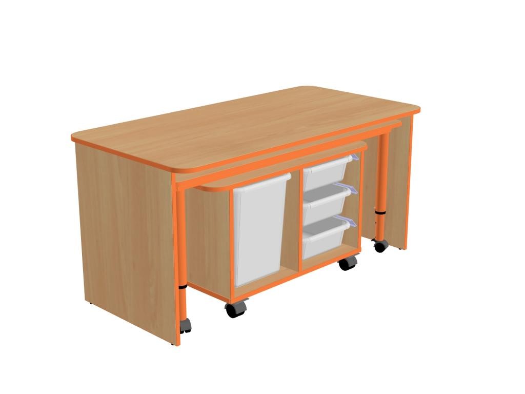 Стол детский письменный (р-р 1180*600*580 мм), Стол детский прямоугольный регулируемый на колесиках (р-р 1120*450*400/460/520/580 мм), Тумба мобильная с лотками р-р 784*450*467 мм). Набор выполнен из ламинированной ДСП 16 мм, торцы обрамлены кантом ПВХ 2 мм. Цвет на выбор.
