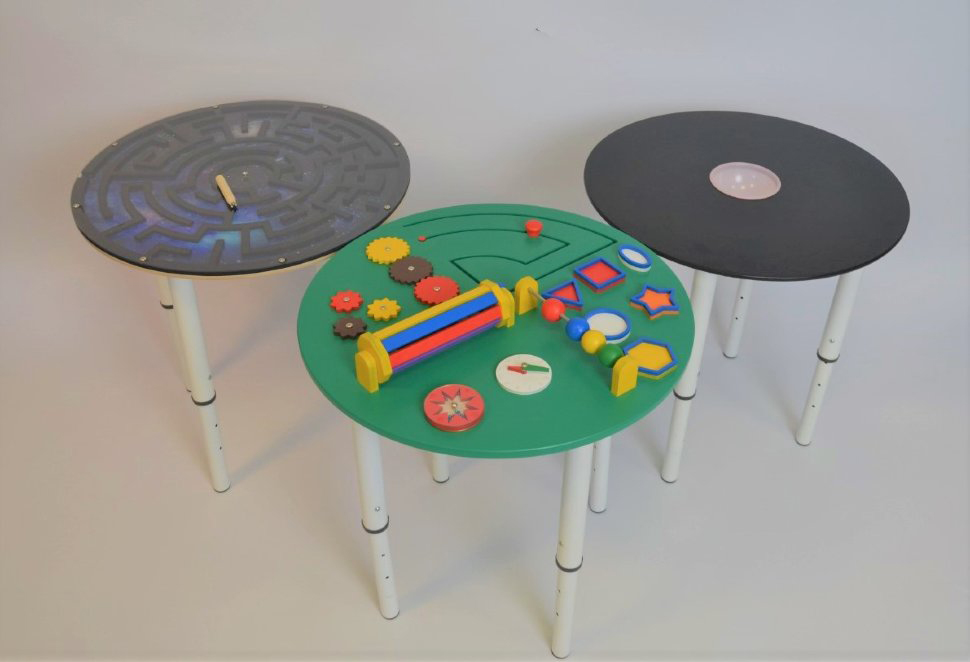 Комплект из 3 столов на регулируемых телескопических ножках, что делает их универсальными. На столешницах расположены игры : на одном дети рисуют мелками, на другом они проходят лабиринт, а на третьем все крутится и движется.