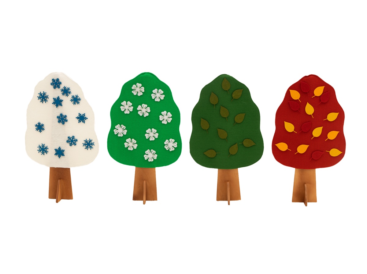 Описание: 4 дерева на подставке, чехлы: 2 зеленых дерева (разных оттенков), 1 белое, 1 красное. Аксессуары к деревьям: зима – снежинки и 12 штук, весна 10 белых цветов, лето – 10 зеленых листочков тополя, осень - 15 листьев тополя (по 5 штук красных, желтых, оранжевых).