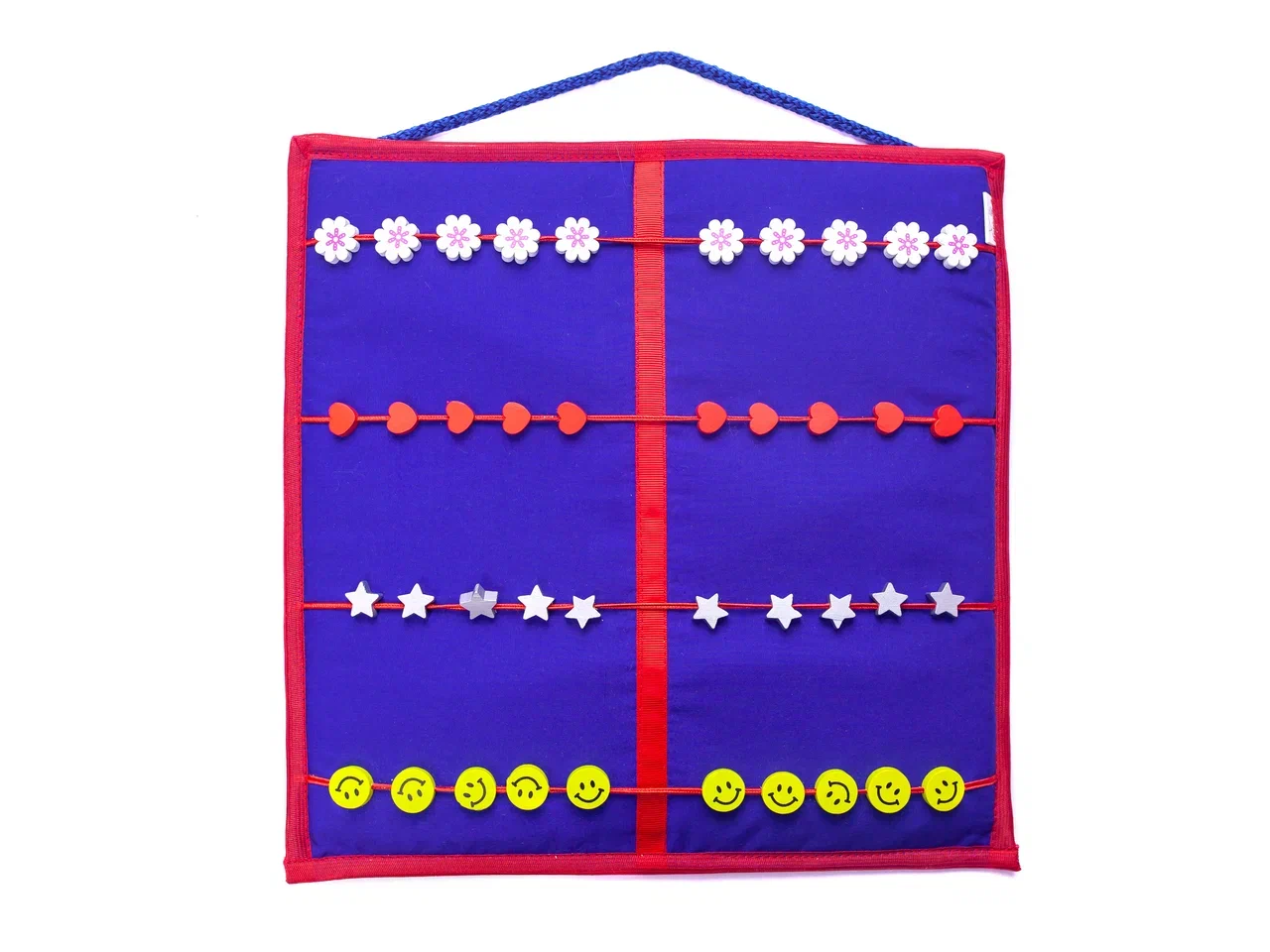 Материал: материал основы — смесовая ткань — 35% хлопка, 65% полиэстера, внутри — геовойлок — 100% полиэстер. Комплектация: спереди на квадрат пришиты 4 шнура, на каждый из которых нанизано по 10 бусин. На каждом шнуре - свои бусины. На квадрат вертикально нашита тесьма, разделяющая квадратпополам. Размер: 30х30 см.