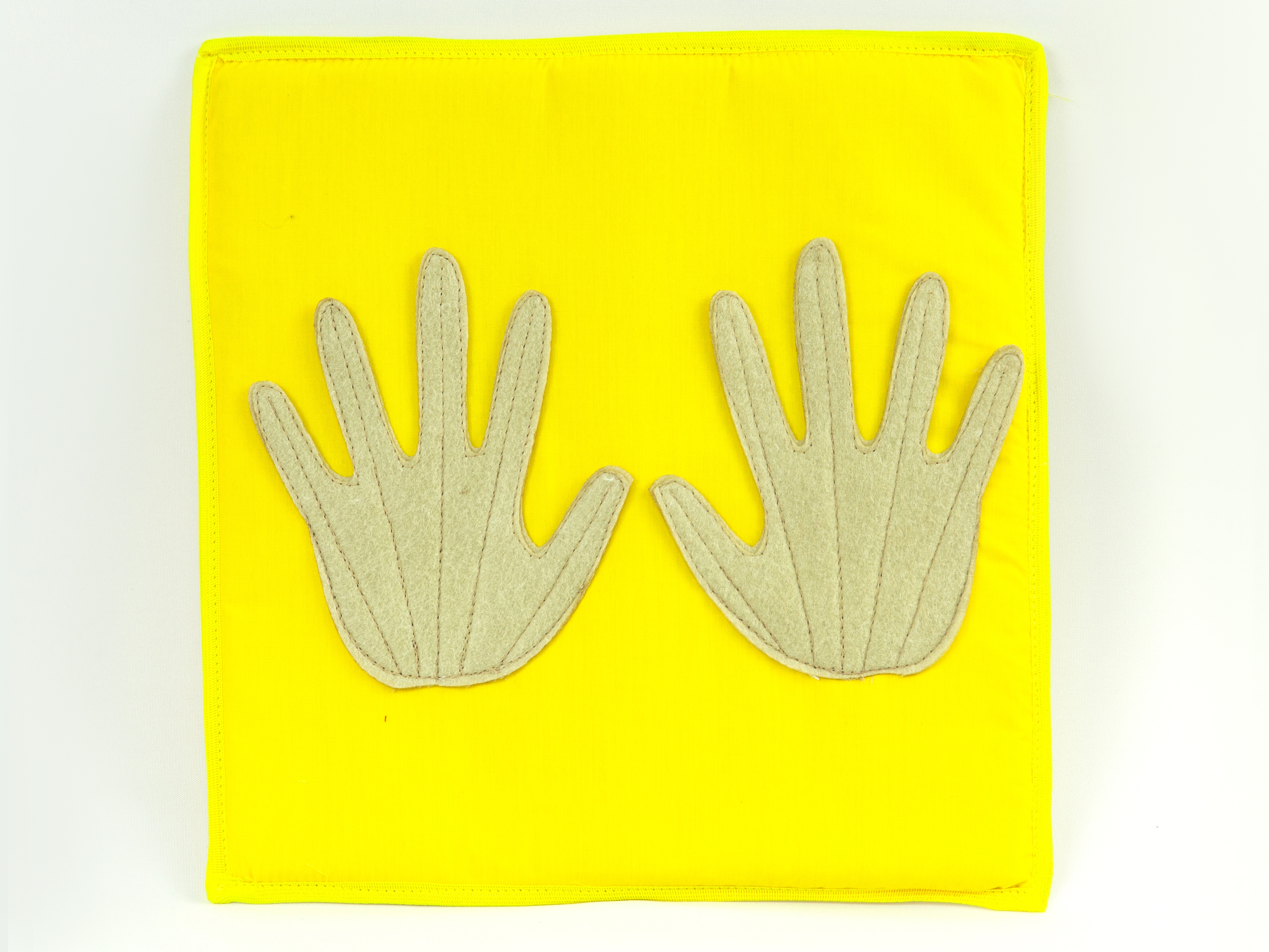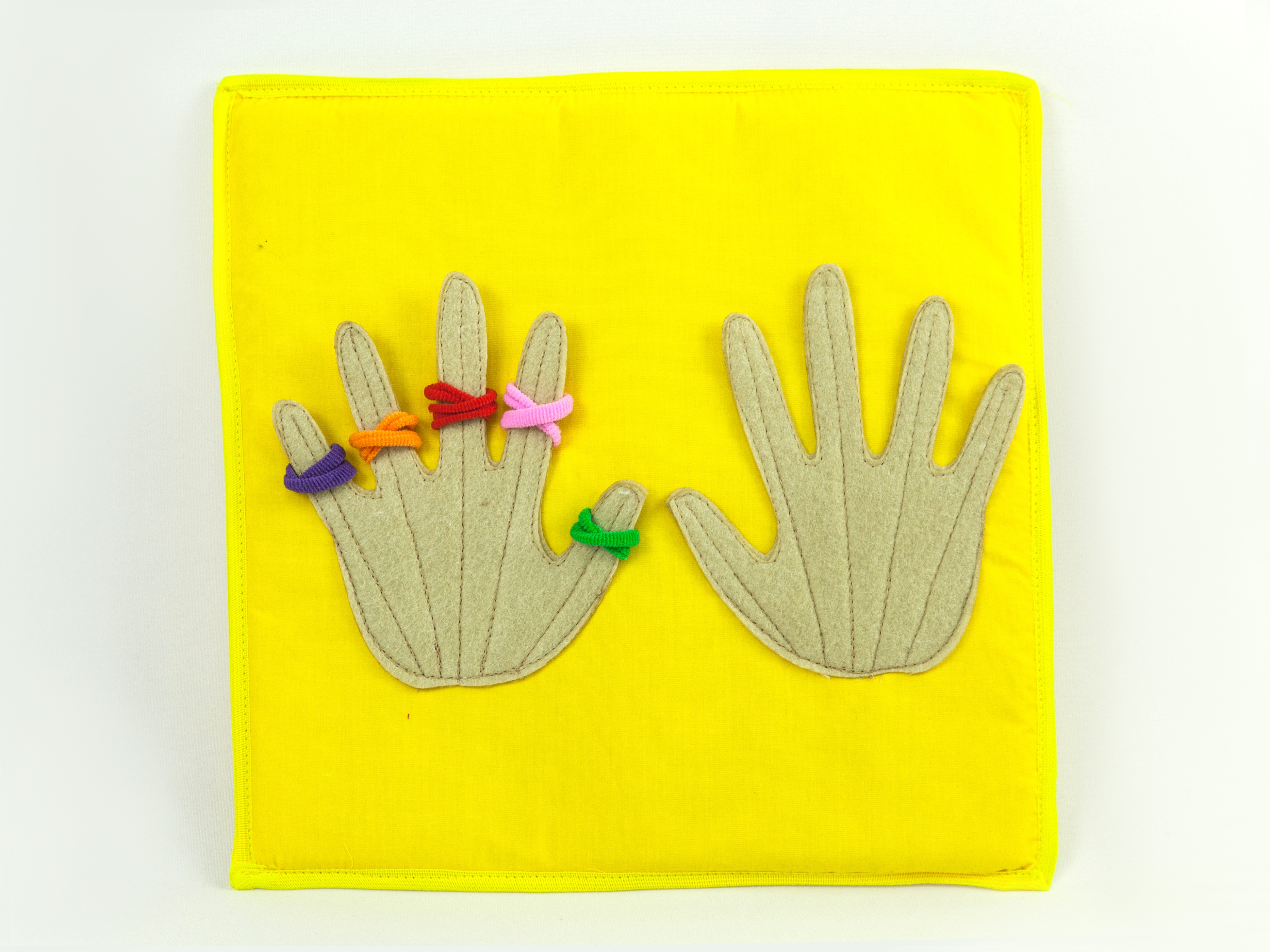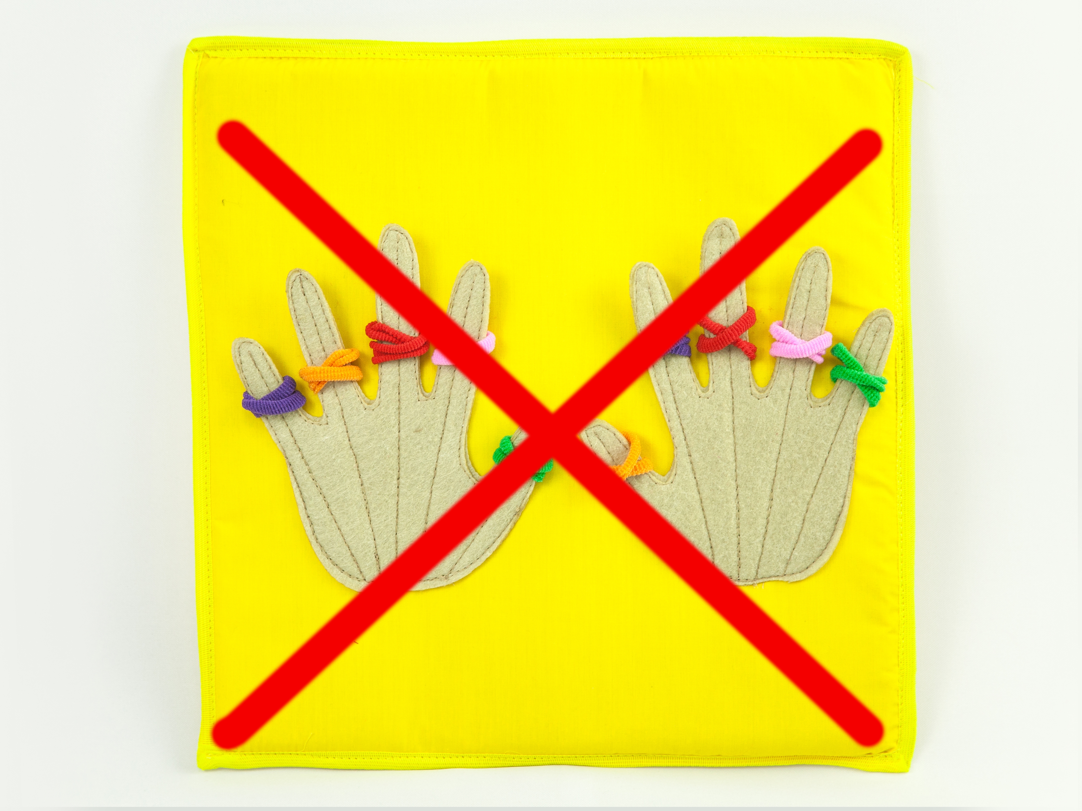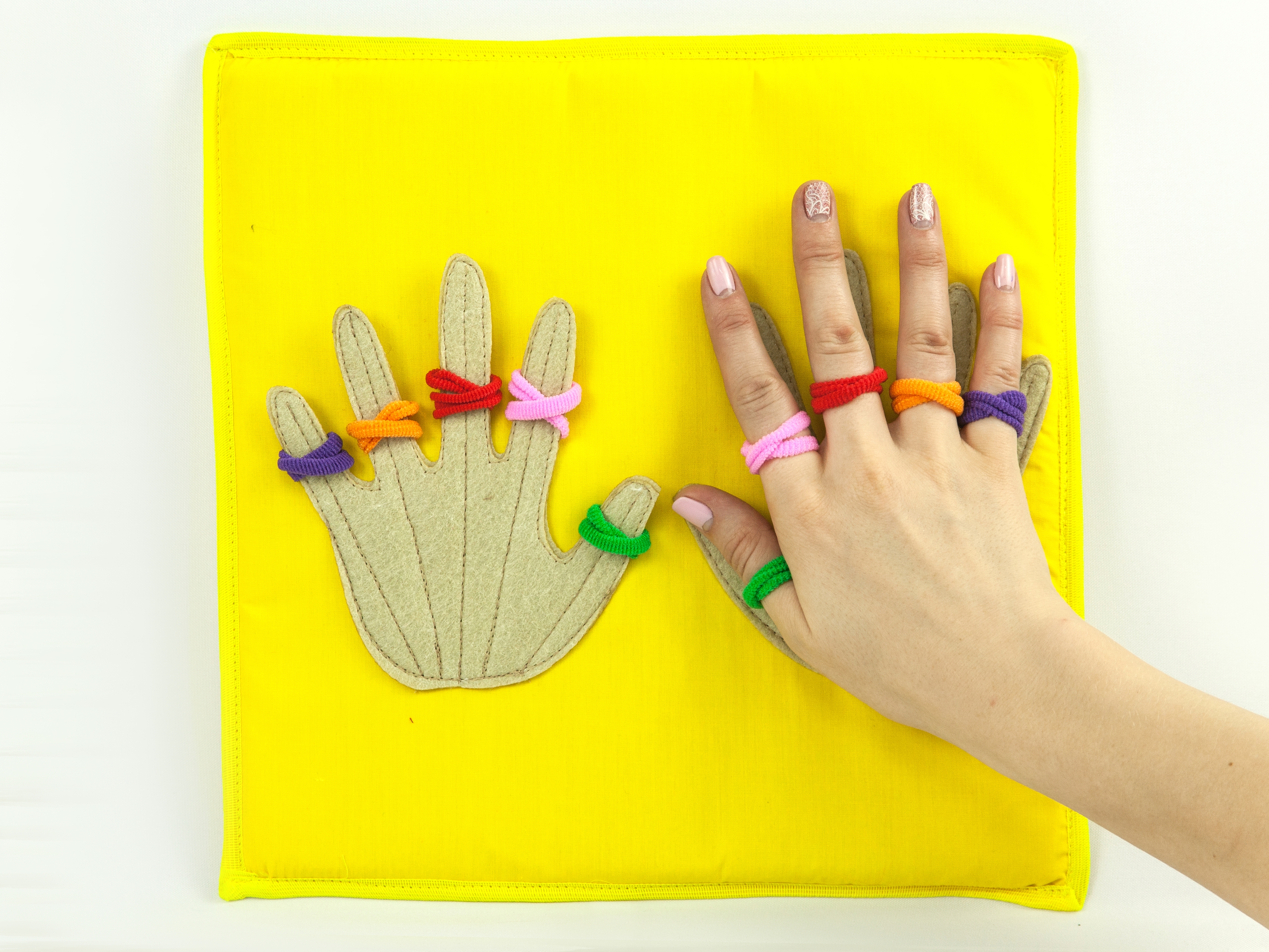 2. Взрослый надевает на руку на квадрате резинки и просит ребенка надеть на другую руку на квадрате резинки в такой же последовательности. При этом он обращает внимание ребенка на то, как расположены пальцы на руках. (Принцип зеркала).