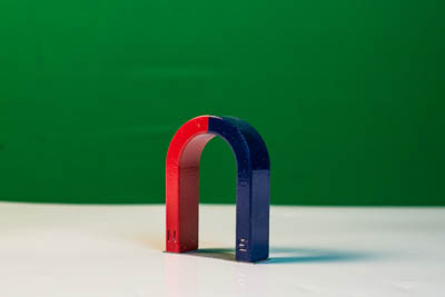 Магнит U-образной формы изготовлен из полосовой стали. Половины магнита окрашены в разные цвета. Разноименные полюса магнитов замкнуты стальной пластиной.