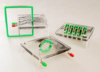 Набор состоит из трех прозрачных планшетов с вязкой прозрачной жидкостью с мелким магнитным порошком, на которых смонтированы модели прямого, кольцеобразного проводников и катушка.