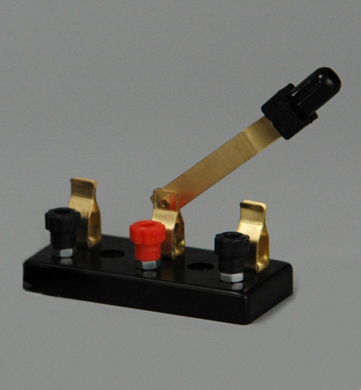 Переключатель однополюсный состоит из пластмассового основания, на котором смонтированы нож переключателя с ручкой, пружинящие губки и три клеммы. Нож может вращаться вокруг оси. Переключатель предназначен для работы при напряжении 12В и силе тока до 2А. Переключатель имеет три позиции переключения.