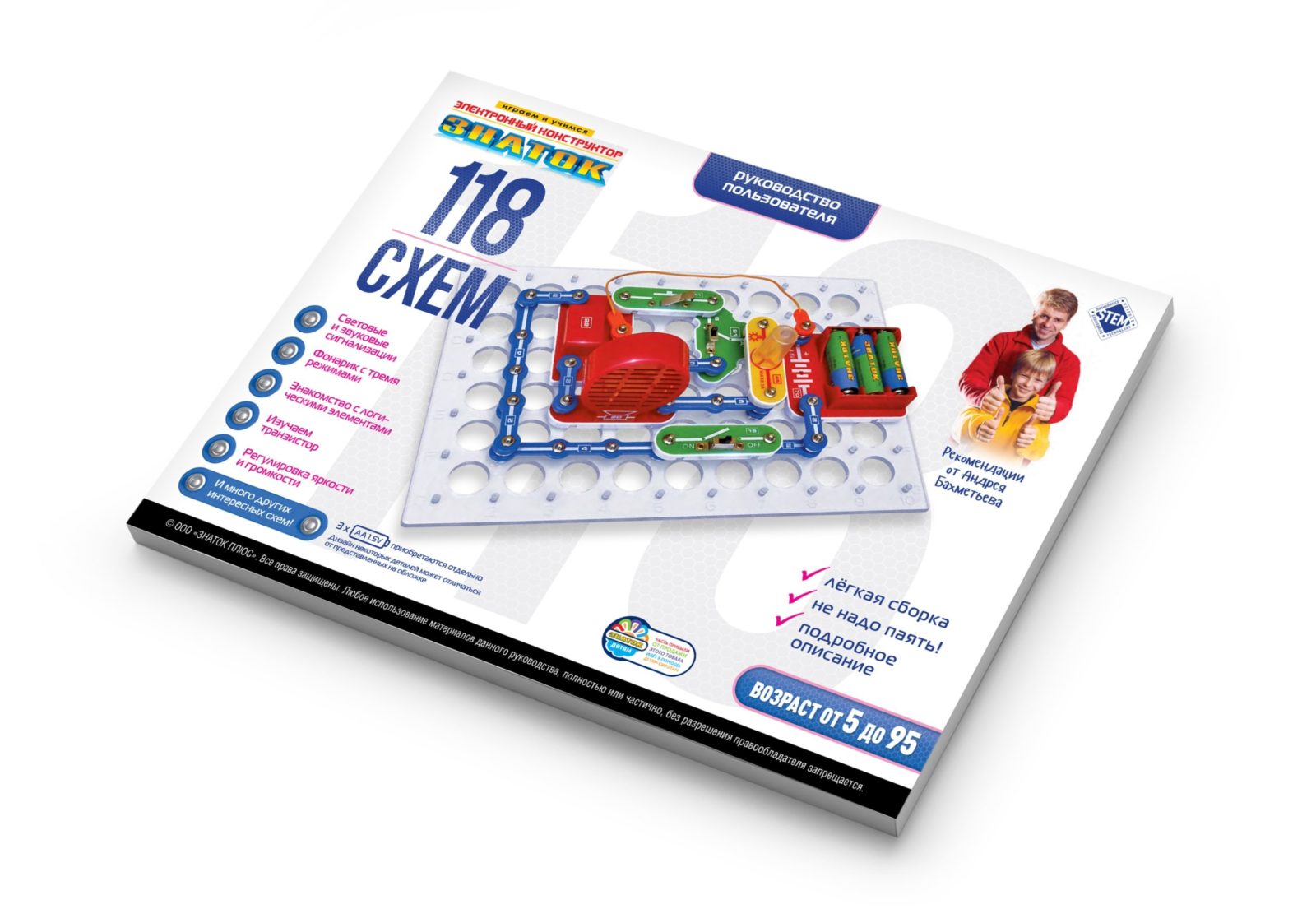 Электронный конструктор начального уровня, позволяющий ребёнку познакомиться с удивительным миром электроники. Даже без помощи взрослых, используя очень понятное цветное руководство, всего за несколько минут, он или она смогут собрать и испытать схему с практически 100% положительным результатом и удивить родителей, друзей, учителей.