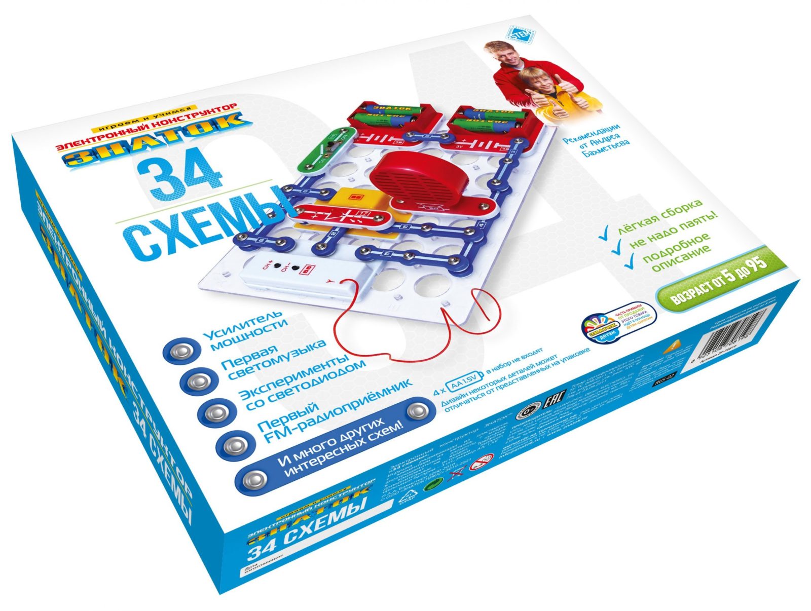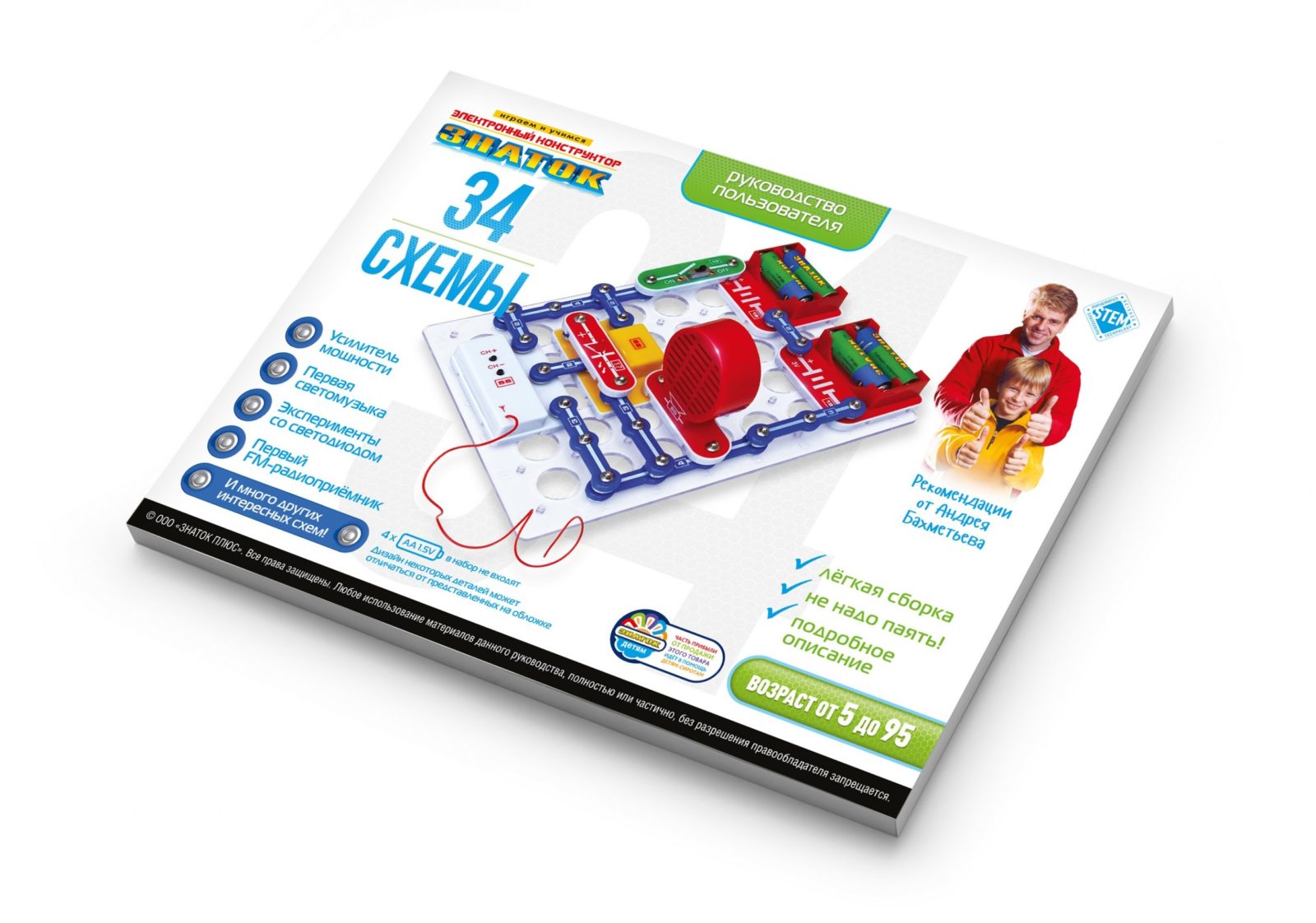 Для того чтобы ребёнок научился не просто собирать электрические схемы, а задумывался над собранным проектом, мы поместили комментарии с пояснениями и задания на быстрое усвоение важных знаний по физике. Мы рекомендуем данный набор для детей 6-12 лет, но фактически конструктор рассчитан практически на любой возраст, мы часто видим, как родители с удовольствием играют вместе с детьми. Простота соединений и ясность описания позволяет собирать сложные схемы даже ребенку пяти лет. 100% положительным результатом можно удивить родителей, друзей, учителей.