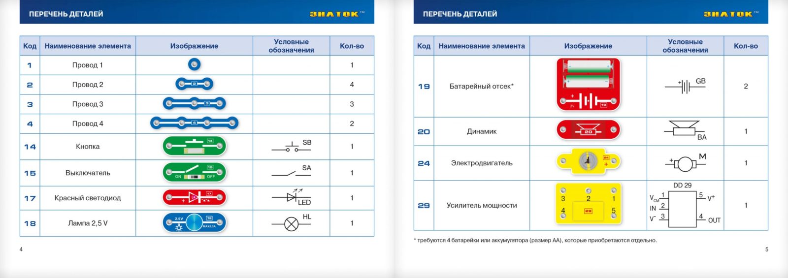 Для работы схем необходимы 4 батареи (приобретаются отдельно) размера АА, напряжением 1,5 V, или аккумуляторы аналогичного размера, напряжением 1.2 V. Подробнее