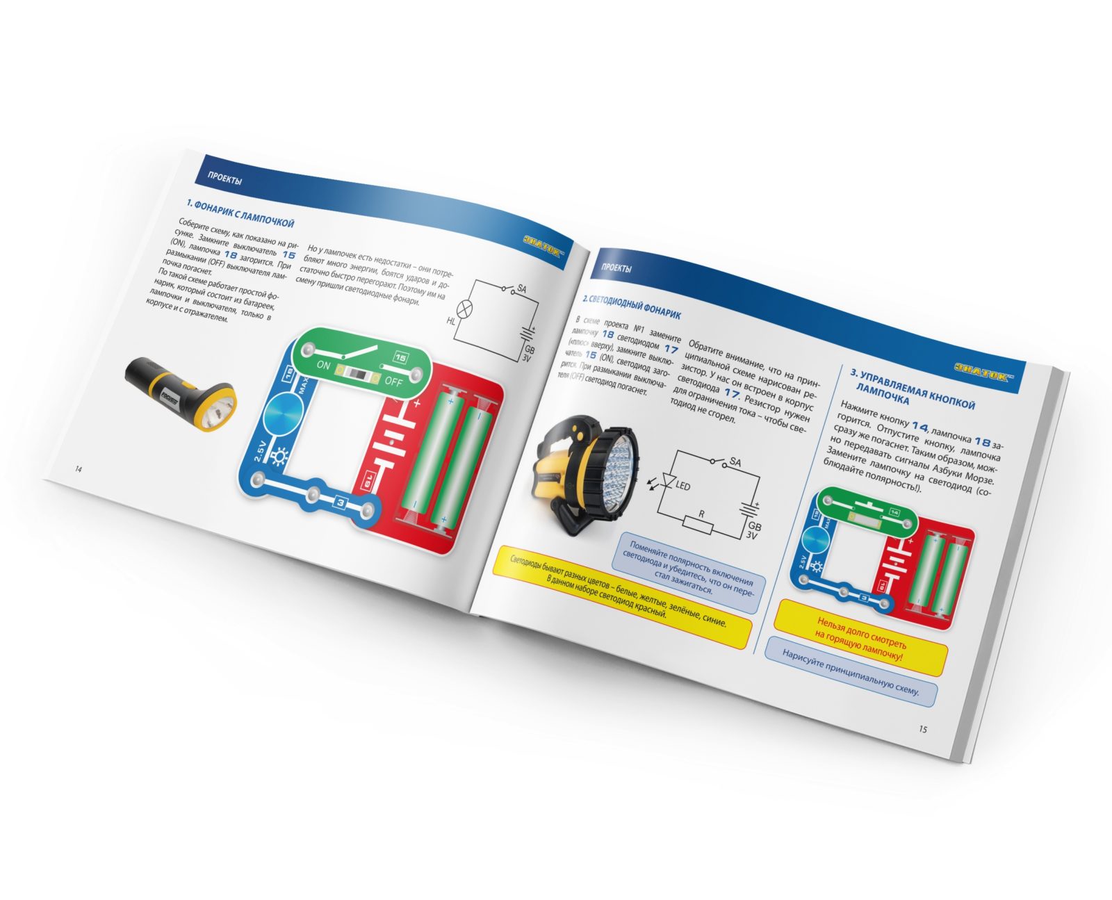 Электронный конструктор начального уровня, позволяющий ребёнку познакомиться с удивительным миром электроники. Даже без помощи взрослых, используя только очень понятное цветное руководство, всего за несколько минут, он или она смогут собрать одну из 69 схем, на которые родители 10 лет назад тратили целые недели. Это отличное подспорье в изучении школьной программы по физике. Многие схемы имеют практическое применение. 100% положительным результатом можно удивить родителей, друзей, учителей.