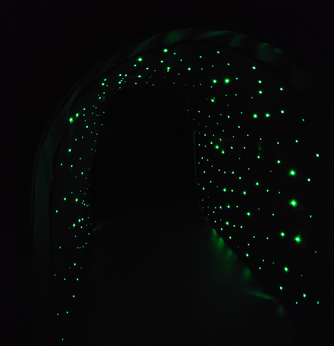 Напольный фиброоптический тоннель со встроенными фиброоптическими волокнами и источником света. Мягкие поролоновые стенки и дно окантованы экокожей. Внутреннее пространство занимает купол из плотного черного фетра с мерцающим звездным небом. Специализированное оборудование создает завораживающий эффект настоящих звезд.